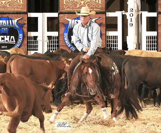Im Highly Decorated, sired by High Brow CD, and bred and owned by Norda and Jim Berger, Simonton, Tex., scored 221.5 points under Thomas Bray to win the Metallic Cat NCHA Summer Spectacular Classic Challenge Open Limited championship. My Beach My Wave, the first horse to the herd in the 13-horse finals, and Lonnie Earl, the last to the herd, tied for reserve with 219 points under Dylan Meyer and Troy Riddle, respectively. My Beach My Wave, by Metallic Cat, is owned by Whit and Kim Davis, Millsap, Tex., and Lonnie Earl, by Spots Hot, is owned by Terry Riddle, Foster, Okla.