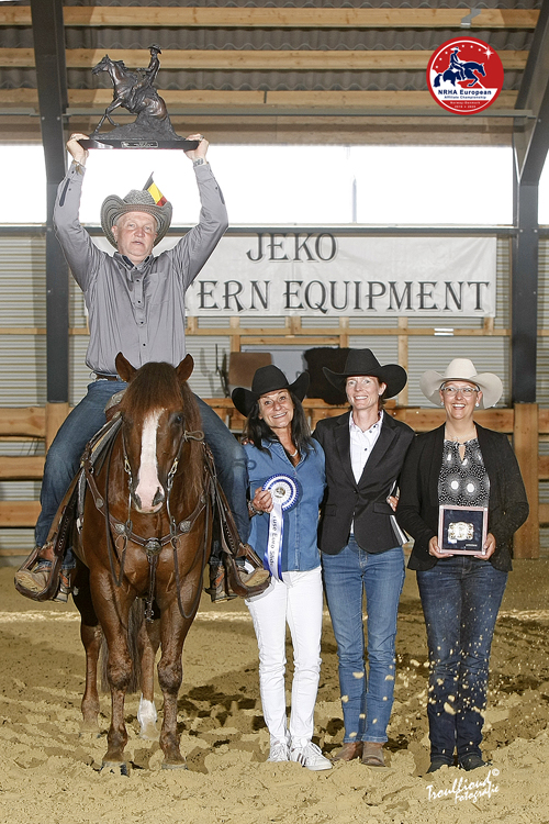 For Jody Fonck of Belgium, this was her first European Affiliate Championship and, with a great 218.5 riding Topgun Showtime, the young rider clinched the NRHA European Affiliate Youth 13&Under Championship. “I started riding a year and a half ago and my goal for the past year was to qualify for this event,” she said. “When I went in the pen today I knew I had to give it all we had but, during my run, because she kept her head so low in the circles, the left rein went over her neck so I had both reins on one side. I carried on trying to keep calm, and she was there for me all the way. I could not be any happier for this win!” Sliding to the second step of the podium with was yet another Belgian rider — Alicia Nouwen — who rode her Sheza Tuff Jacky to a 217. “I’m very proud of my horse because before this class, for some reason, she was very nervous. Once she went in the pen she calmed down and was just great for me,” said Alicia who was quick to credit her trainer, Wim Vervecken for her result. “I’ve had her for two years now, and thanks to my great trainer we managed to make it to the podium.” It was a special day for 12-year-old Oliver Svensson of Sweden who took third place honors with Shes Madonna, a mare his father [NRHA Professional Johan Svensson] purchased for him three years ago. “I am so proud of my horse,” said Oliver. “She is 16-years-old and when we bought her she was a lesson horse at a riding facility. My father helped me to train her but I have been the only one to ride her. This is a great day for me and, since she is in foal, this will be her last show…I really look forward to riding her baby!”