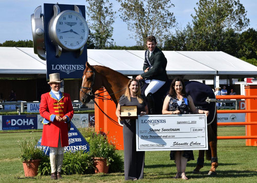 Ireland’s Shane Sweetnam won the $30,000 LONGINES Leading Rider Challenge at the Hampton Classic, receiving a check for $30,000 and a beautiful new LONGINES timepiece. In the seven years the award has been in place, Sweetnam has won it three times. Photo by © Shawn McMillen
