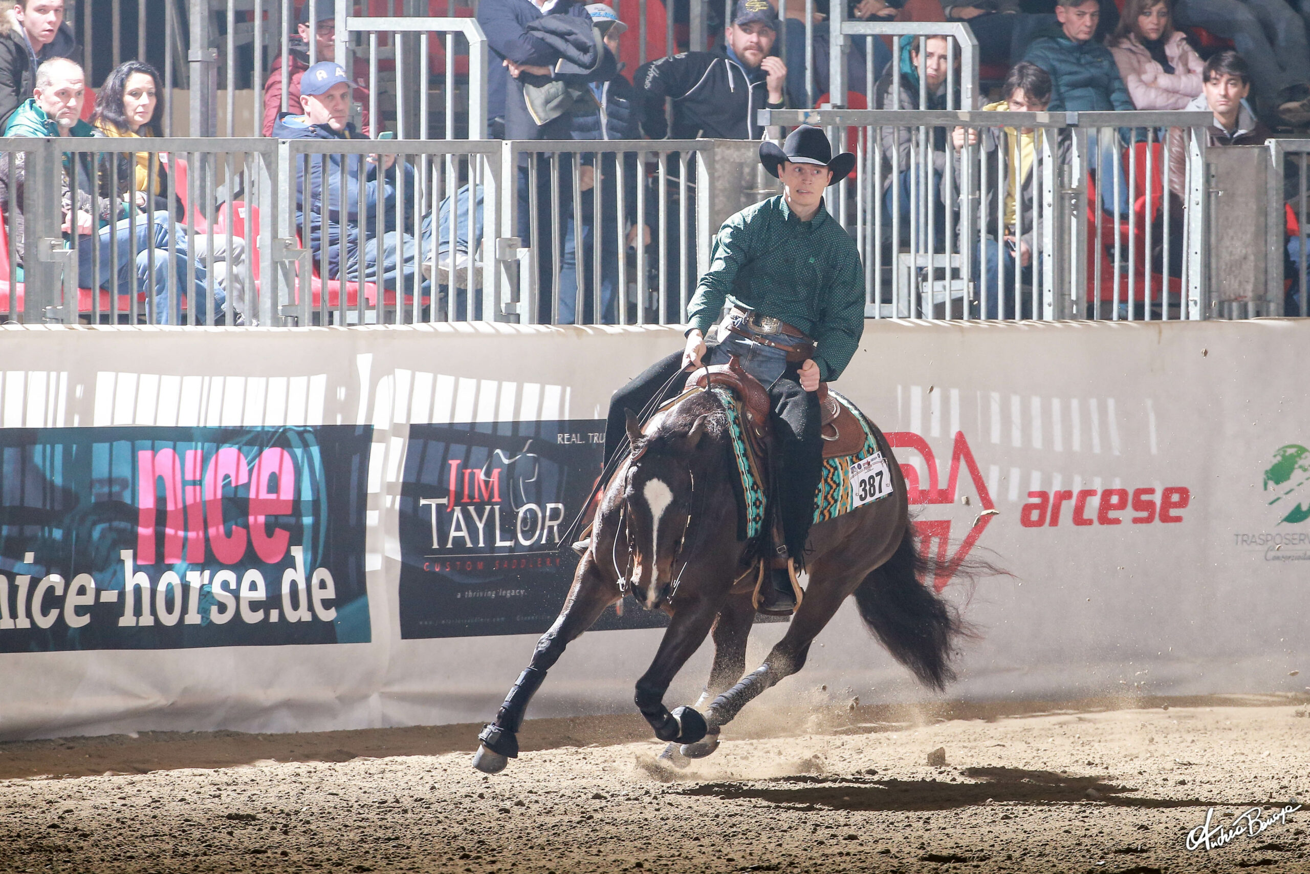 Gabriele Carrarini and his home-bred CG Smart N Gold (Arc Surprising Smart x Arc Girl Chic N Gold) scored a 214 in the finals taking home the 16.000 euro-added L2 Non Pro Championship as well as the Reserve Championship in the L4 and L3. “This is a very special night for me,” he said. “Not only was he born at our place, we actually own both the sire and the dam. Chris Lucchina broke him and then he was in training with Cristina Fiscella for a few months. I took over the reins after that short period and have mainly trained him myself, even though I try to go and ride with Max Ruggeri who has been my mentor for the past ten years. It’s been a pretty special show season as I won the Austrian Futurity as well as the Lombardy regional futurity.”
