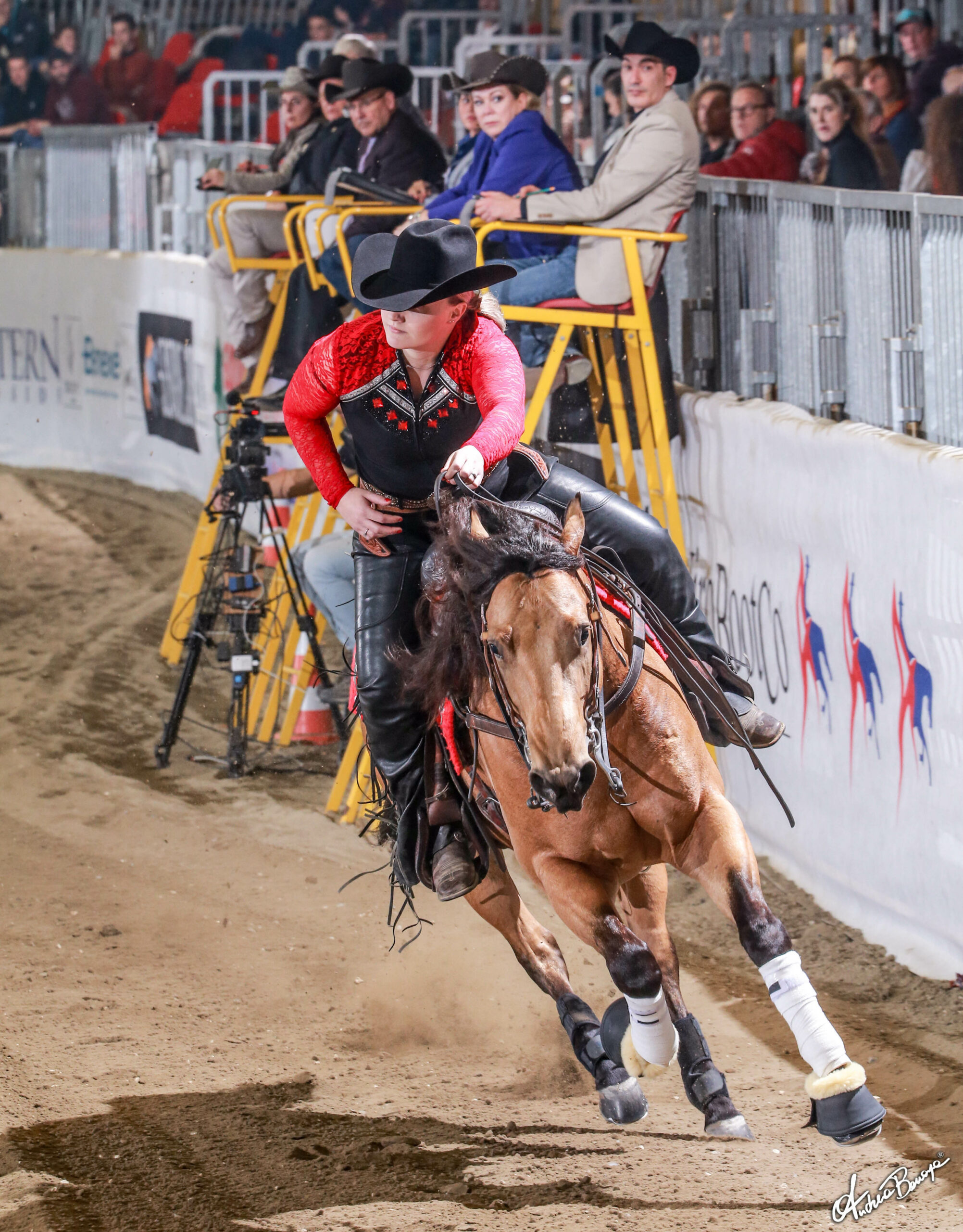Sharon De Groot of the Netherlands and her own Tinsel Whizington (Tinsel Jac x Conquistador Sis) added another title to the string of success they’ve had in the show pen this year by winning the 11.000 euro-added L1 Non Pro division with a 210. The duo earned the Austrian Non Pro Futurity Reserve Championship, the NRHA Belgium L2 and L1 Non Pro Futurity Championship and the NRHA France L4 Non Pro Futurity. “He’s really sweet and he does everything for me,” said the Dutch Rider. “He’s a funny horse, he loves to play around, but when you ride him he’s always ready to go. I’m really proud of him and I have to thank my trainer Quentin Galliere and his wife Kimmy Obenhaus for the work they did with him, and Dominik Reminder for helping me here since Quentin and Kimmy just had a baby and of course stayed home.”