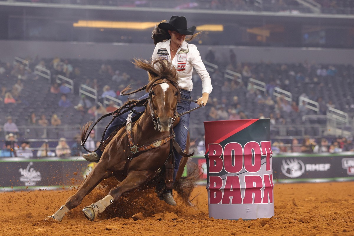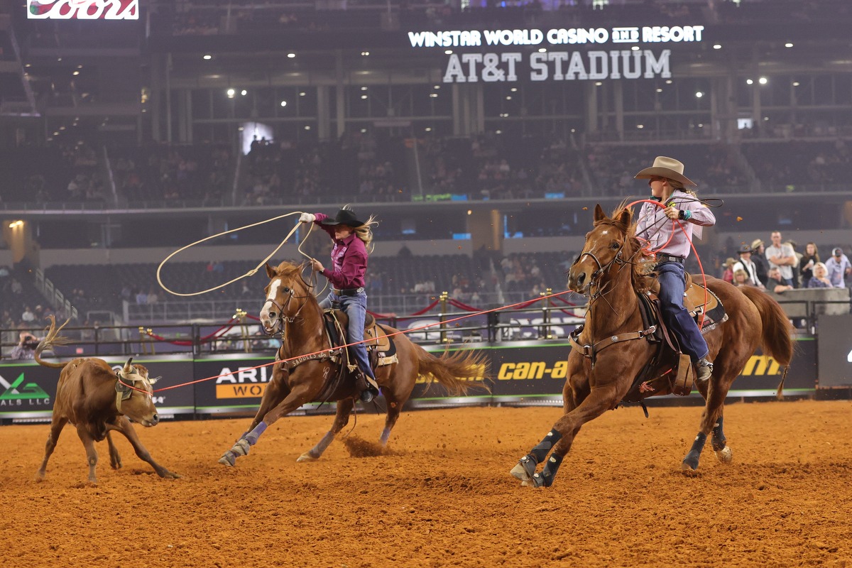 As the first discipline of the championship round, team roping had fans inside the home of the NFL’s Dallas Cowboys on the edge of their seat Friday night throughout the action-packed performance where challengers prevailed. After no qualified times in the first four runs of the performance, the team roping duo Rylie Smith (Whitsett, Texas) and Hope Thompson (Abilene, Texas) backed into the box calm and collected and logged the only qualified run of the night with a 13.66-second effort. With only one qualified run in the team roping, all athletes who did not record a qualified time were paid a $5,000 appearance fee, adding an additional $30,000 EACH in ground money to Smith and Thompson’s payday. The Texas natives took home $90,000 individually, a Jesse Jaymes Silversmith’s buckle and a Women’s Rodeo World Champion Title.