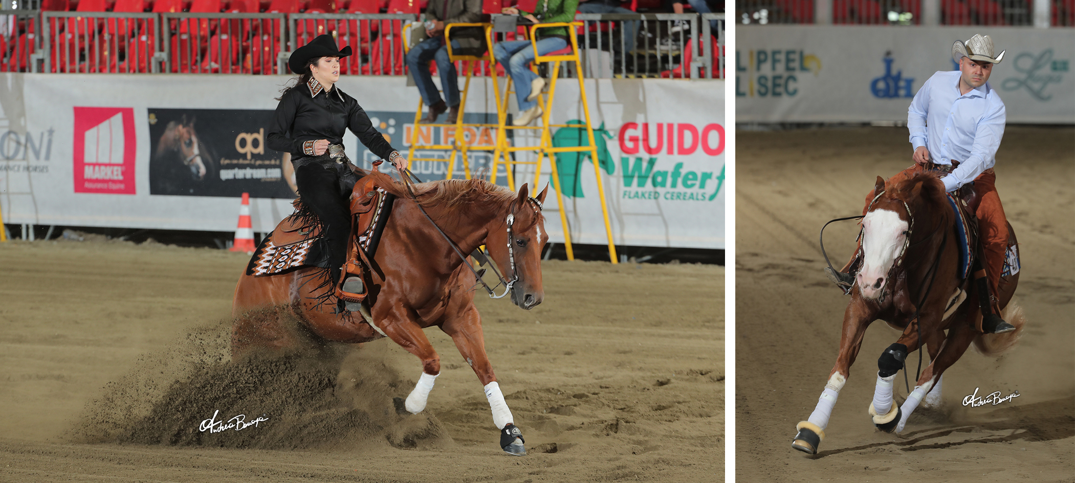 Jessica Sternberg and Andrea Iannetta tied to lead the L2 division with a 213 score. Sternberg of Great Britain rode A Ruff Spookin Gal, a mare by NRHA Six Million Dollar Sire Smart Spook out of A Ruf Gal bred, owned and nominated by Rosanne Sternberg; Italy’s Iannetta rode his own Hollywood Gun Bodo (Hollywood Gun Dunnit x Doc Snapper Bar), a mare nominated by Alessandro Bodei.