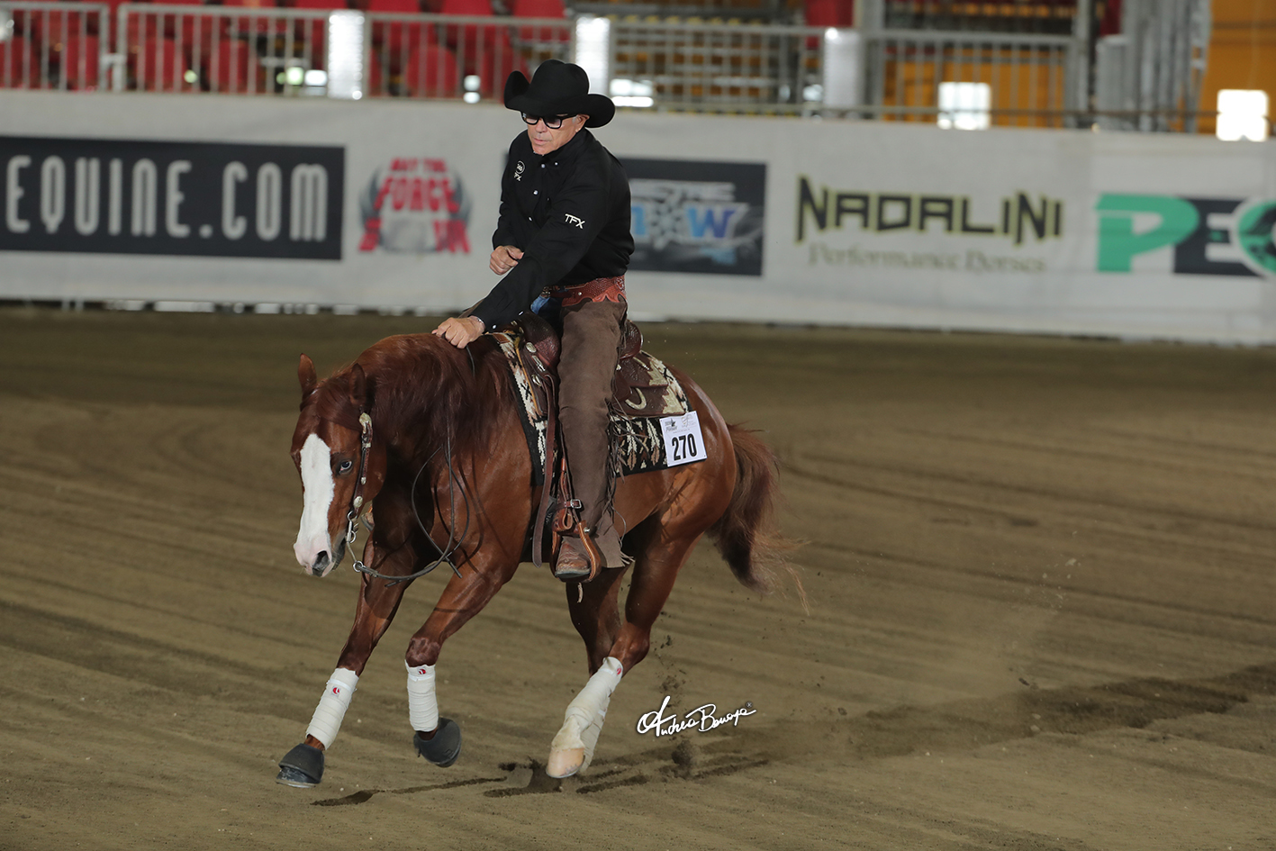 Piero Priori of Italy rode Lil Joe Gun 246, a stallion by NRHA Lil Joe Cash out of Gunna Sing, bred and nominated by Priori, to top the L1 division.