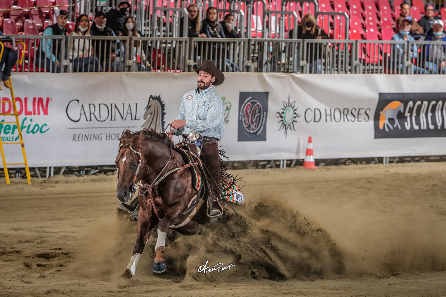 The first section of the NRHA European Open Futurity closed the day with Manuel Cortesi and AR Vintage Dream (NRHA Two Million Dollar Sire A Sparkling Vintage x Sweet Candy Dream), posting a 222—the highest score of the day— to lead the L4 Open division as well as the IRHA 4-year-old L4 Open Futurity. The sorrel stallion, owned by Azienda Agricola Cortesi Piero, was bred by Luigi Parise and nominated by Elisabetta Raviola. The second section will start the day on Sunday, May 16 and will be followed by the 2020 Quarter Dream IRHA/IRHBA Non Pro Futurity.