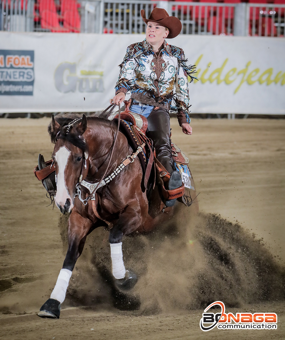 Belgian Bo Brutsaert and her KB CJ Gun, owned by her father Koen, closed her run with a 216 to win both the L3 and L2 Non Pro Championships. “This is the first horse by my old stallion SJ Whiz and out of one of my mares [KB Jenny Whiz A Gun], so I’m super excited,” said Brutsaert who also won the 2020 IRHA 4-year-old L2 Non Pro Futurity with her mount, bred by Bruko Reining and nominated by Koen Brutsaert. “We didn’t show that much due to the pandemic and I’m super happy to be back in the show pen even though, without having the opportunity to practice I was also a little scared before going in. I ride with Kim Obenhaus, who trained the mare since she was a 3-year-old, and this is her very first big show. Even though she’s not super easy, it’s so much fun to ride and show her. I want to put some money on her, have her join our string of broodmares and continue with my stallion’s bloodline.”