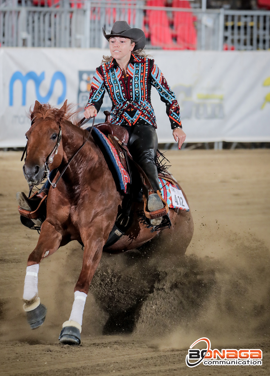 The young German rider not only made it to Italy, she performed to the highest score— a 223.5— in the qualifying go round, rode to top honors in the NRHA European Futurity Level (L)4 Non Pro Finals, all aboard One Mr JJ (Colonels Shining Gun x QHR Jamaica Express), where she also claimed reserve honors. “I showed ‘JJ,’ in the NRHA Non Pro Futurity in the U.S., where we made the finals, and then went on to show him in the U.S. He only arrived in Europe five days before this show, and that was a big gamble,” said Schumacher about the stallion owned and nominated by XCS Ranch LLC and bred by Brent Loseke. “I’m really happy it worked out and he was truly amazing here from day one. I have to thank Ann and Bernard Fonck for following up our training before coming here, and during the show. Now the plan is to go to some schooling shows and see what will come up for us.”