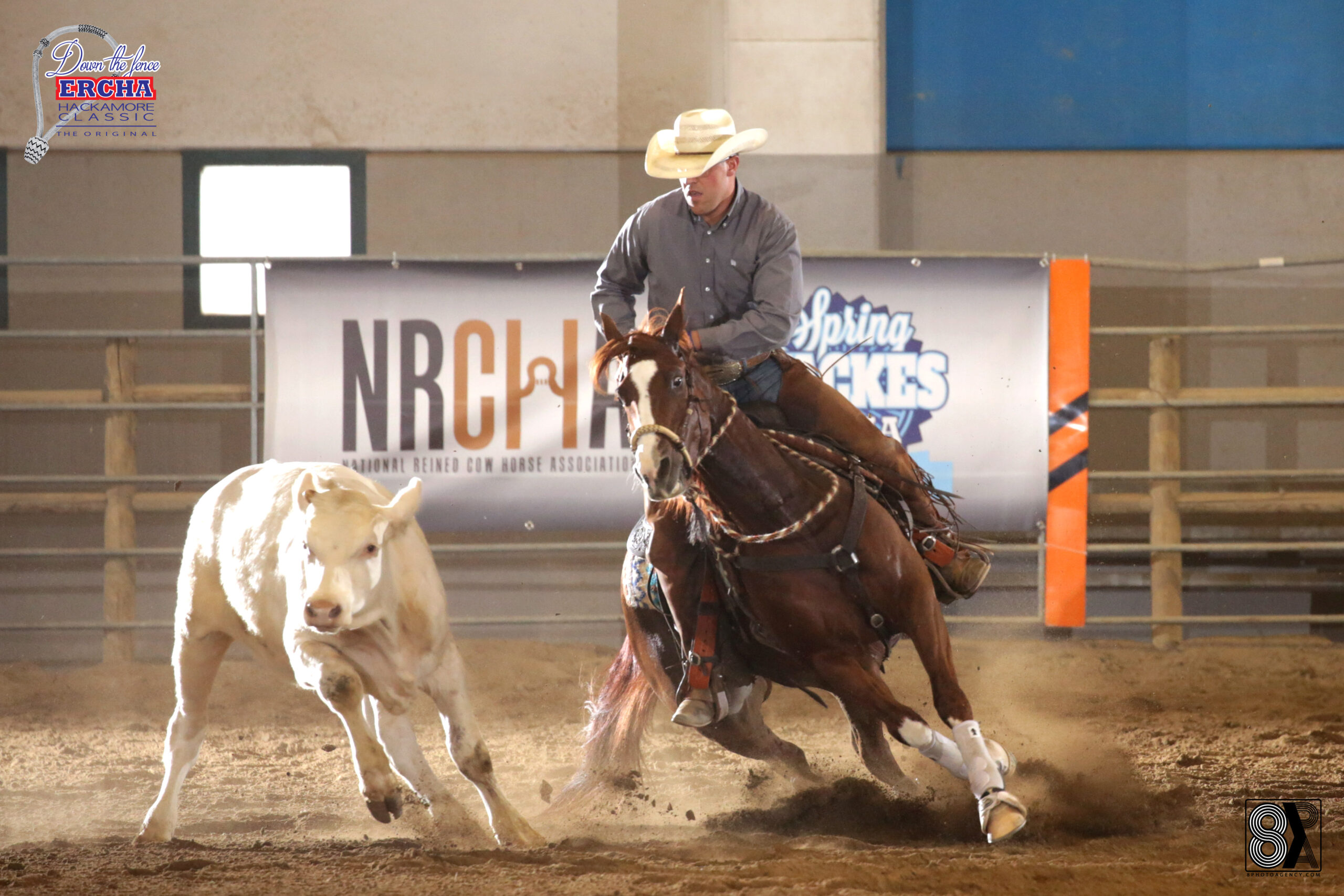 Past ERCHA/NRCHA Open Spring Stakes Champions Giovanni Campanaro and Shesa Genuinelypepto, an American Quarter Horse mare sired by Oaks Lone Pepto out of Genuinely Snapper owned by Loris Paone, took reserve honors with a 215.5 composite score (rein work 70.5; herd work 72; fence work 73).