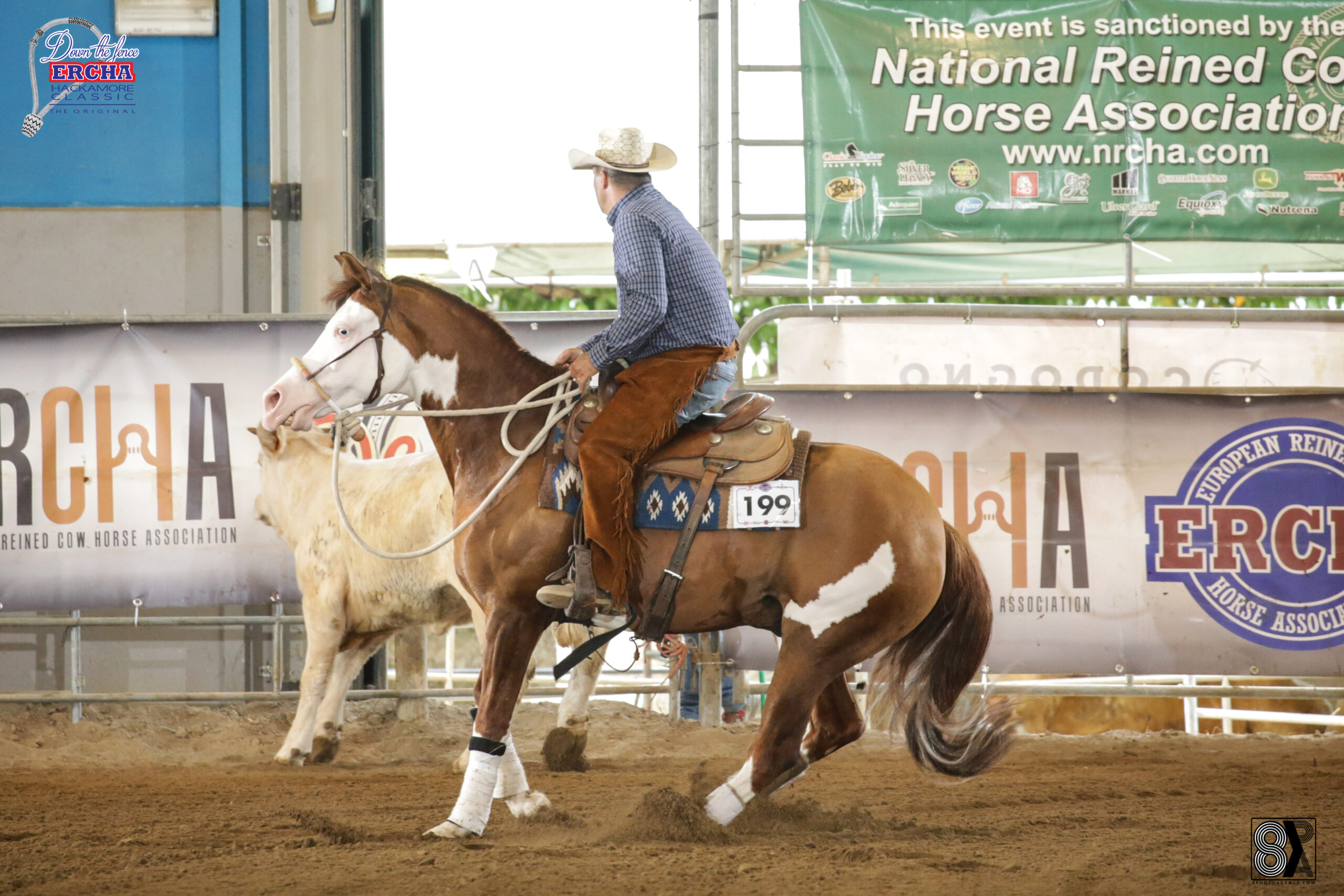 The Italian professional and ERCHA president also scored a 146 (rein work 72; fence work 74) aboard Oh Cay Mc (Metallic Cat x Oh Cay Meriah) owned by Yvonne Bonda to win the $300-added ERCHA/NRCHA Open Two Rein. With a 143 composite score (rein work 71, fence work 72) Federico Fanti rode Andrea Panizza ’s Ans Stylish Susy (More Than Stylish x Ans Wyatt Snappy) for second spot.