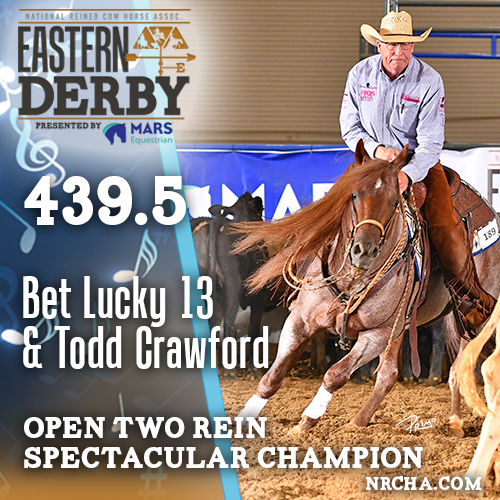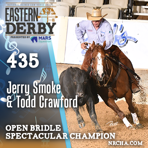 Todd Crawford was draw four in a 16-horse Open Bridle Spectacular cow work field. He ignited the arena with a textbook, and thrilling, fence run, then waited to see if his 146 on the cow would keep him atop the class. When the final whistle blew, Crawford and Jerry Smoke (Dual R Smokin x Kool Arista Cat x Cats Merada), owned and bred by J Five Horse Ranch Management, marked a 435 (R:144/H:145/C:146) to earn the title and $2,940 at the Dom Conicelli Memorial Eastern Derby.