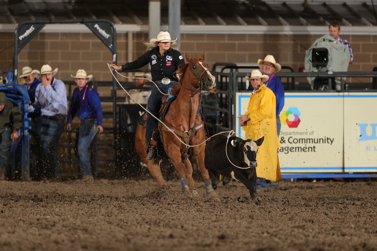 Bradi Good of Abilene, TX, made her trip to Utah count stopping the clock in 2.52 in the women’s breakaway roping. She will be looking to carry her momentum into the final round on Saturday night to earn her first Days of ’47 medal.