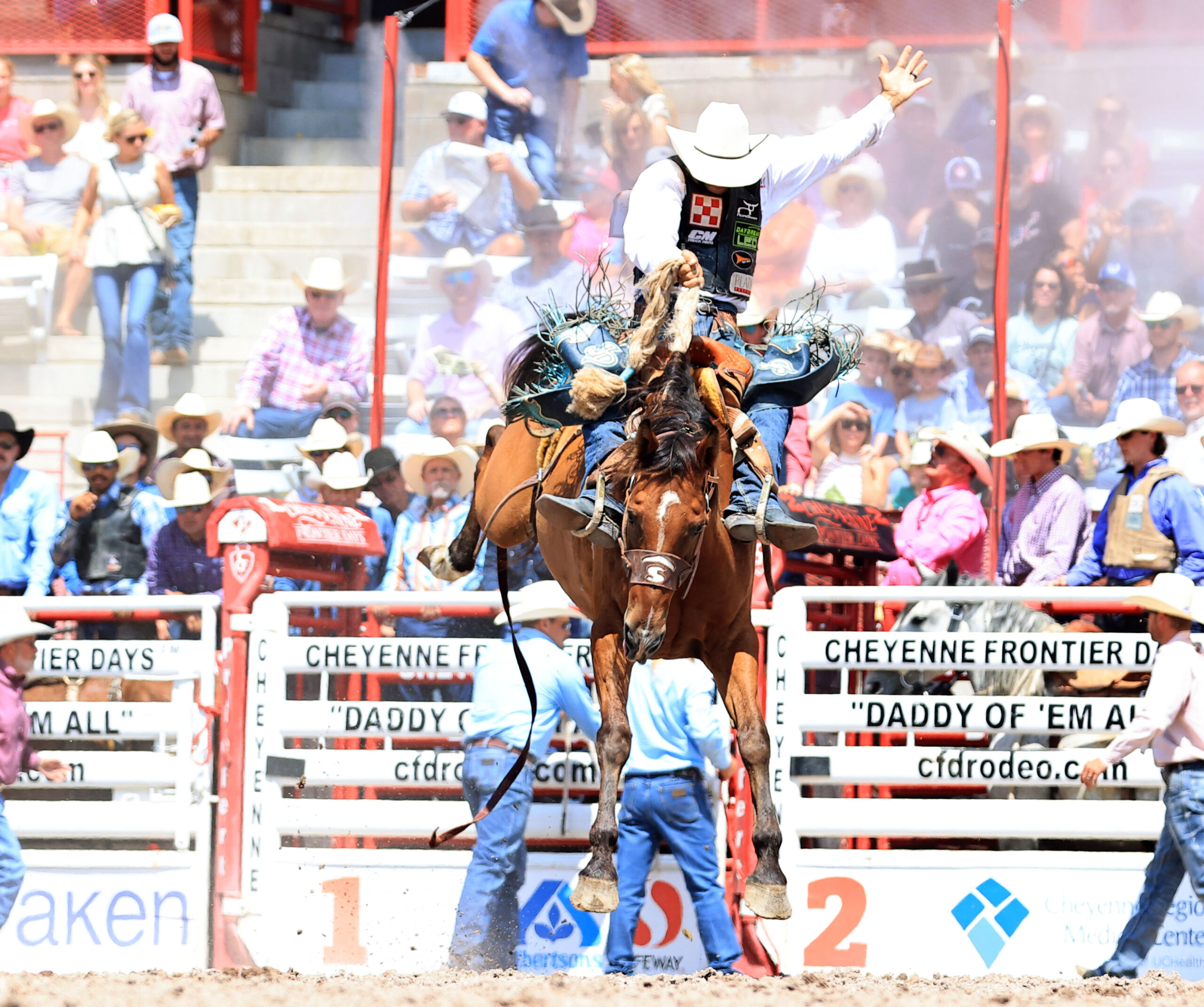 If either one remains at the top of the board through the Semi Finals and Championship Finals, it would be their first title at the “Daddy of ‘em All.” Brody Cress, who calls Hillsdale, Wyoming home and is a local favorite, has won the saddle bronc riding at the last three rodeos here in Cheyenne. Cress also rode today, but his score was not high enough to advance him to the Semi Finals.