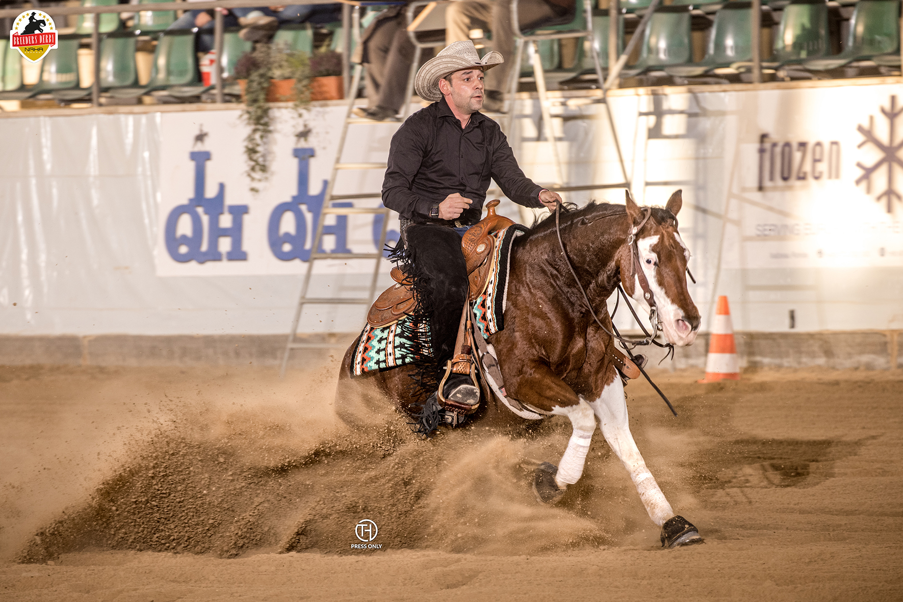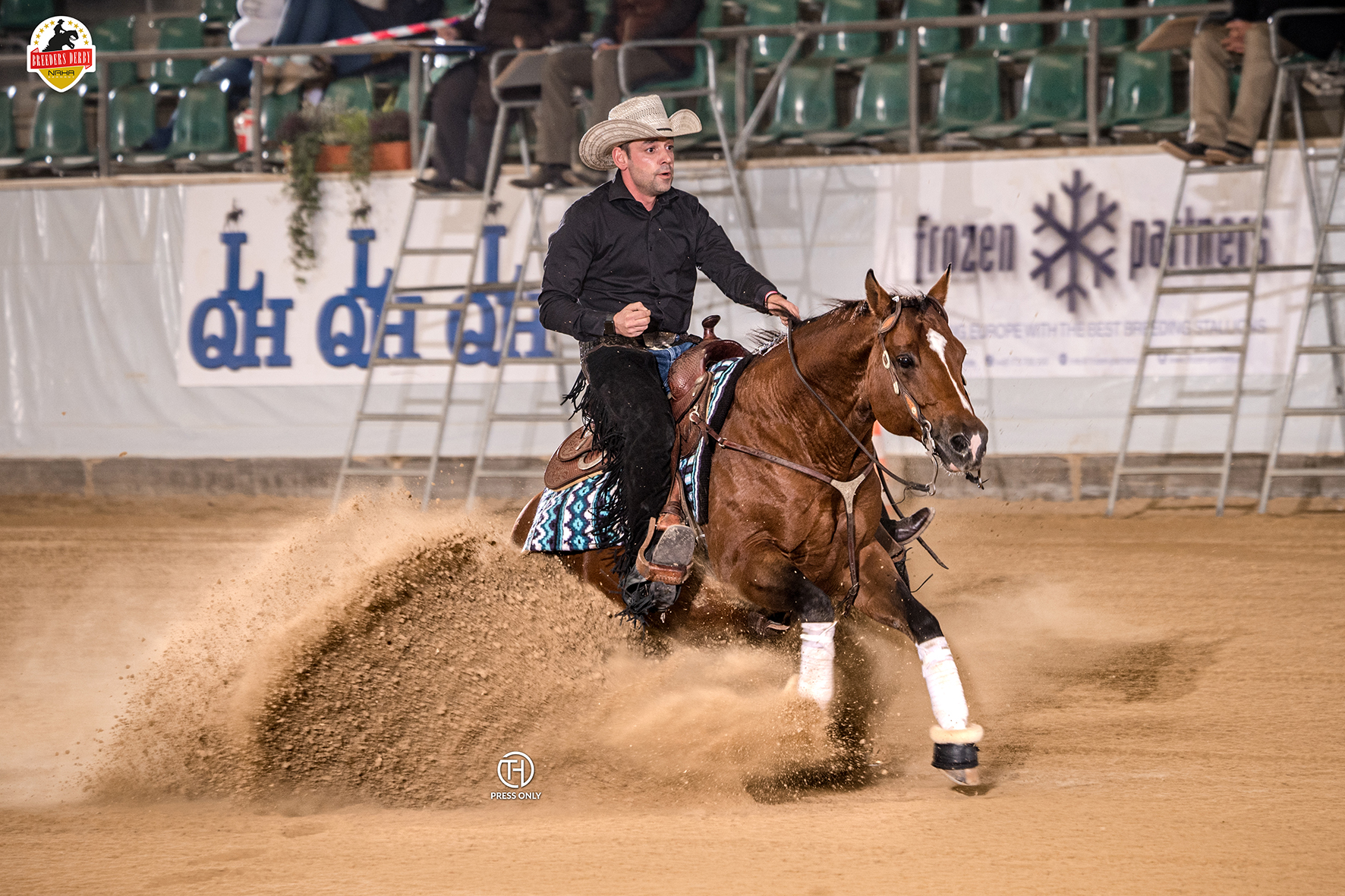 It was an exciting evening for Sven Bösl who rode HP Big Chex To Gun, a 2013 APHA stallion by NRHA Million Dollar Sire Big Chex To Cash out of AC Nala Peppy Gun, to the Level 1 Championship scoring 215 for owner Katrin Guglhör.