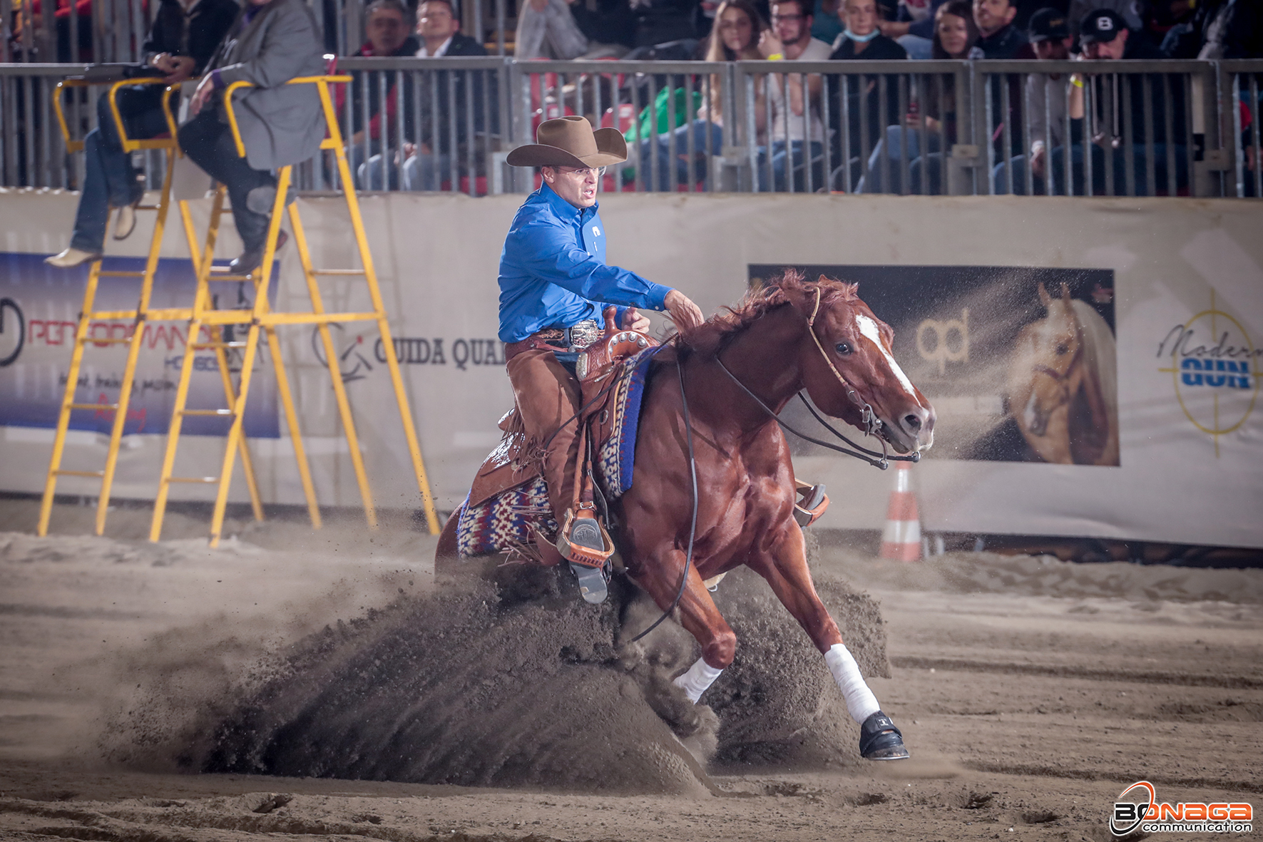 First to go in Section 2 of the Open $196,686-added Level (L) 4 Open Finals, Mirko Midili set the bar by posting a 221.5 on Frozen Natrashya, a stallion owned and bred by Angelucci Quarter Horses by NRHA Five Million Dollar Sire Gunnatrashya out of Frozen Tari. Eighteen horses later, Midili burst into the oval arena of CremonaFiere with Spark Made Whiz, a stallion by Spark N Whiz out of Mare Made owned by Luga Quarter Horses and bred by Silvano Ronzullo. With an explosive ride, the Italian Professional bested his own score by performing to a 223 which remained the top score with four horse and riders left to go.