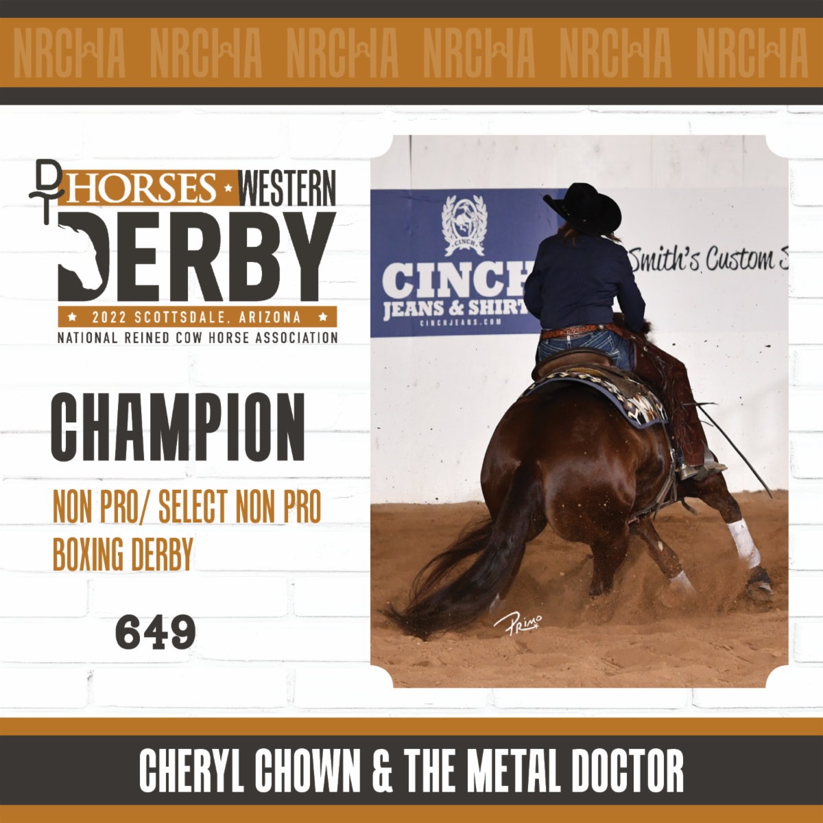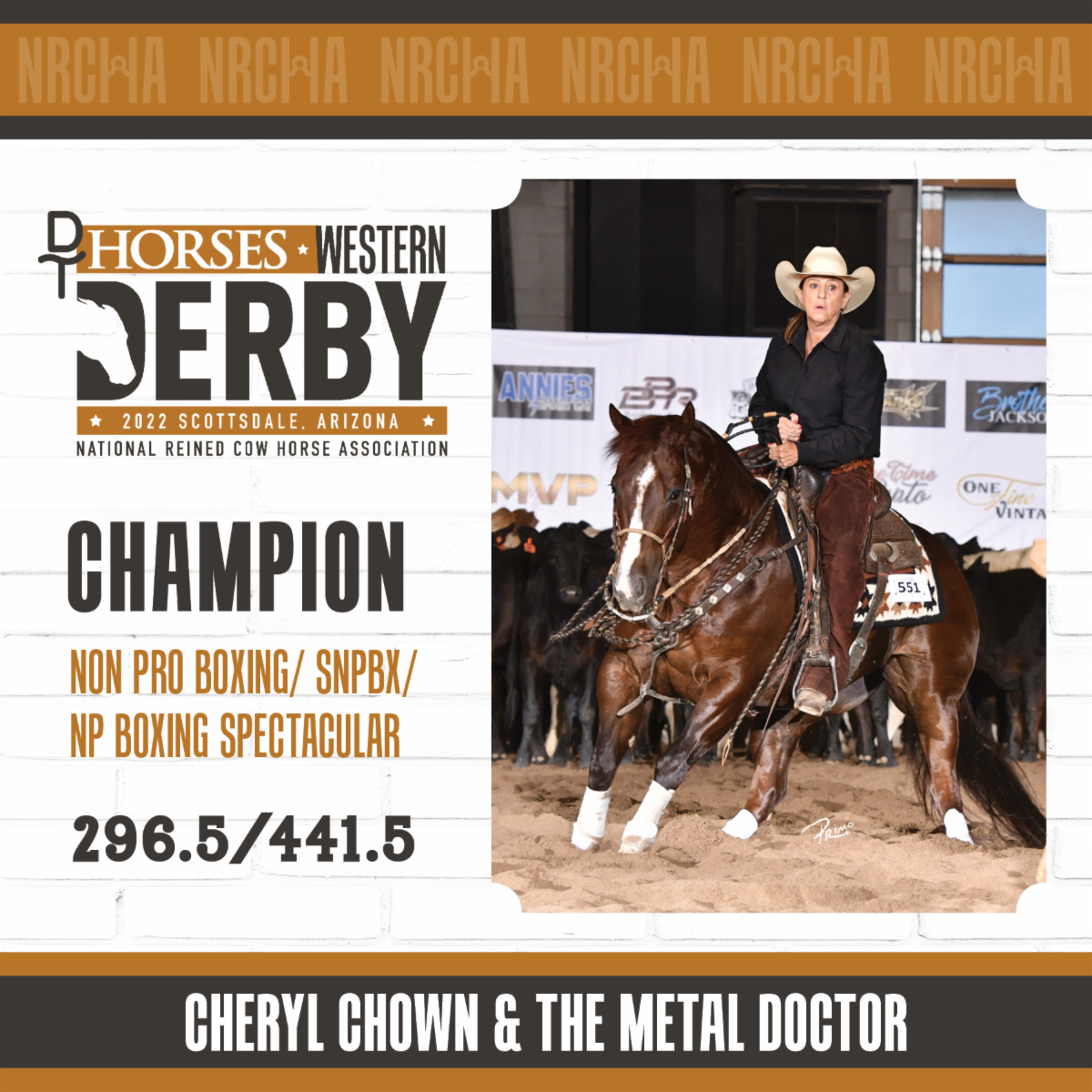 Cheryl Chown and The Metal Doctor added two more titles to their already impressive show. The pair won both the Non Pro Boxing Derby and Select Non Pro Boxing Derby titles with a composite score of 649 (H:217/R:213.5/C:218.5) and won a combined check of $3,534.36.