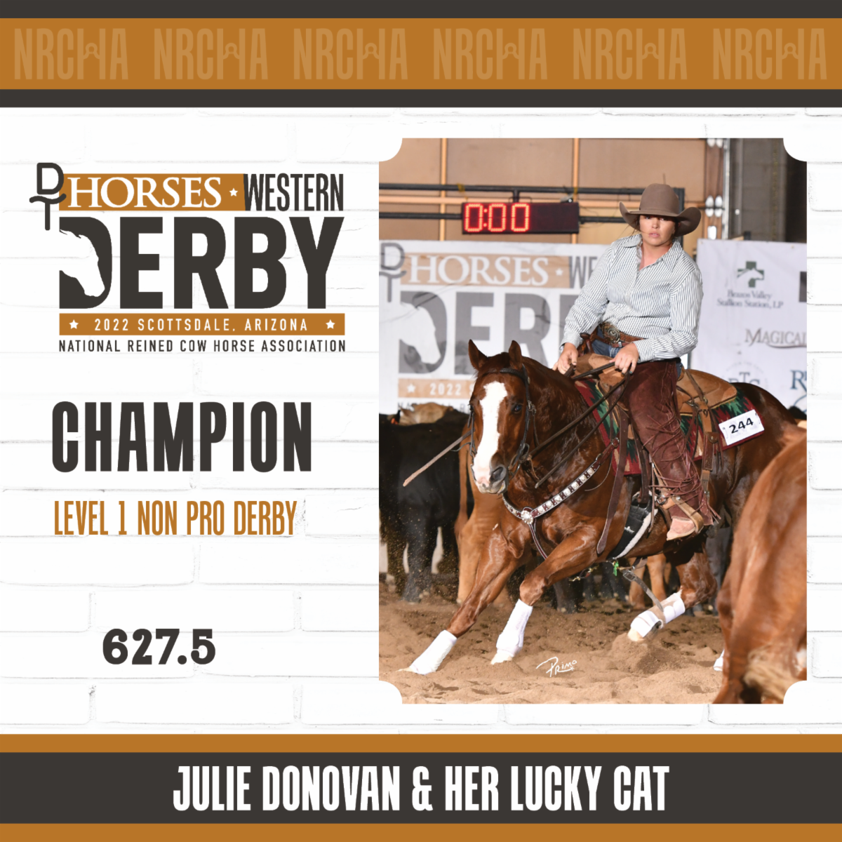 Julie Donovan rode Her Lucky Cat to a composite score of 627.5 (H:208/ R:214.5/ C:205) to win the Level 1 Non Pro Derby.