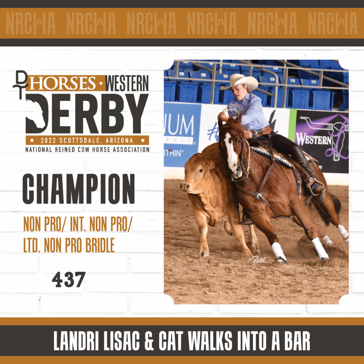 It was a clean sweep for Landri Lisac in the Non Pro Bridle classes. Lisac marked a 437 (R:216/C:221) on Cat Walks Into A Bar to win the Non Pro, Intermediate Non Pro and Limited Non Pro Bridle classes.