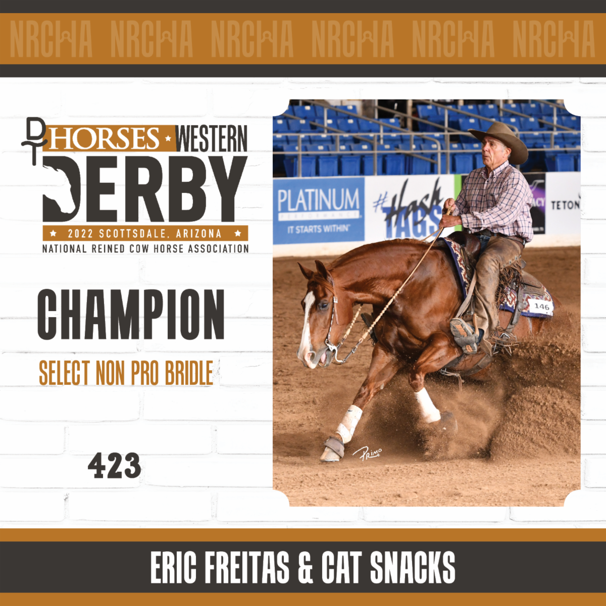 Eric Freitas and Cat Snacks marked a 423 composite score (R:215.5/C:207.5) to win the Select Non Pro Bridle.