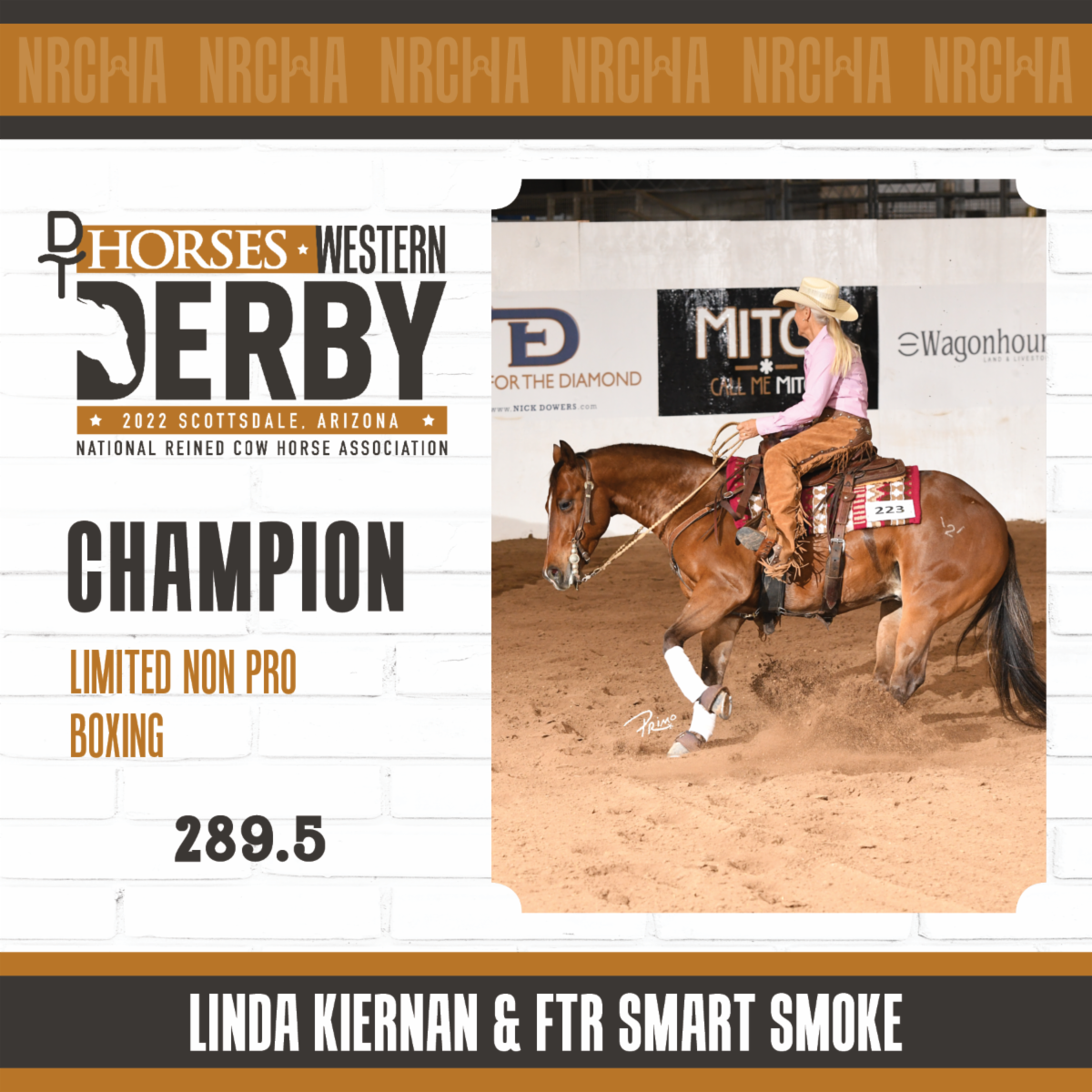 Linda Kiernan showed her gelding, FTR Smart Smoke to a 289.5 to win the Limited Non Pro Boxing. Marking a 144 in the rein work and a 145.5 on the cow, the pair earned first place and a check $480.