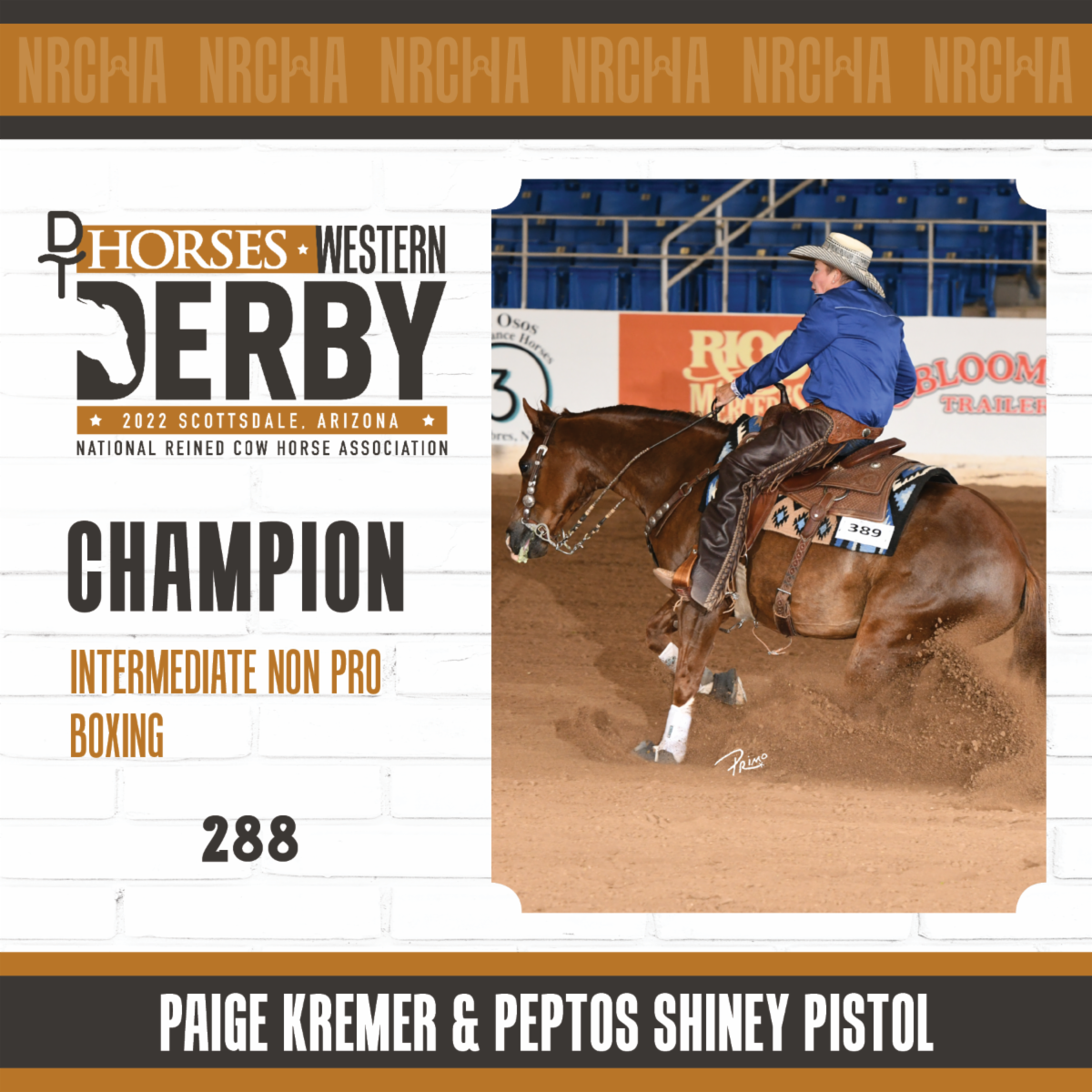 Paige Kramer rode Pepto Shiney Pistol to a 288 to claim the Intermediate Non Pro Boxing Title. The pair wo a check for $812 by marking a 144 in the rein work and a 145.5 on the cow.
