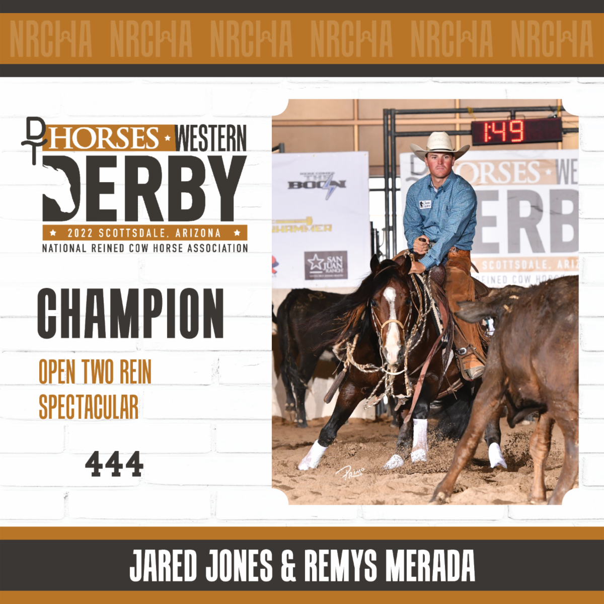 After scoring a massive 151 in the herd work, Remys Merada and Jared Jones led the Open Two Rein by three points. In the final set of the rein and cow work, Remys Merada and Jones marked a 147 in the rein work and a 148 on the cow, securing the title by three points and taking home a check of $5,500 for owner Lucava Farms, Inc.