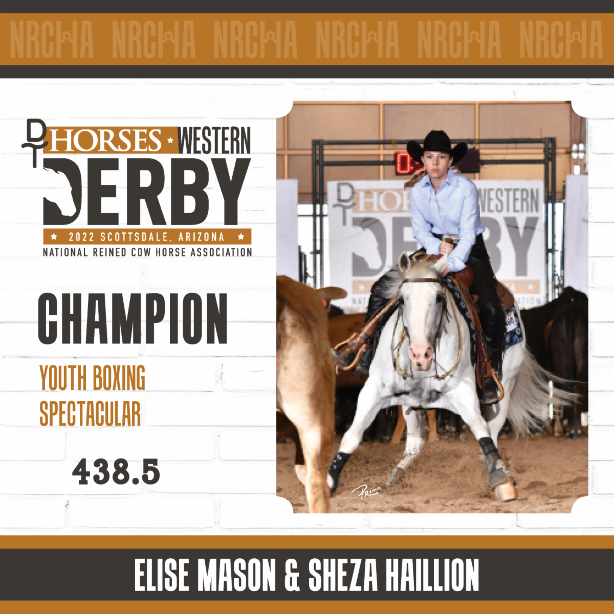 Elise Mason and Sheza Haillion are no strangers to the winners circle. The duo started off with a 146 in the herd work, putting them in second going into the rein and cow work on Friday. Mason laid down a solid run in the rein work, marking a 143.5, and ended with a huge 149 on the cow, securing them a check for $450 and the Youth Boxing Spectacular title.