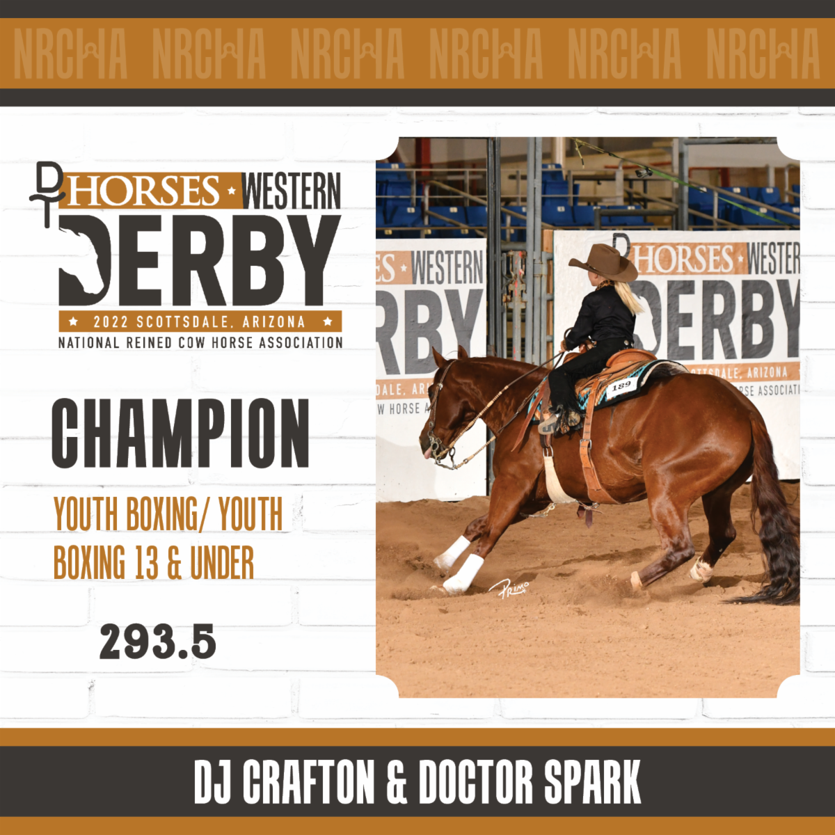 The 10-year-old from Colorado, was not phased that she was one of the youngest in the Youth Boxing. DJ Crafton showed Doctor Spark, a 2013 gelding, to a 293.5. The pair marked a 145.5 to be the highest score in the rein work and then marked a 148 on the cow. Crafton secured a check for $210 and took home the tiles in both the Youth Boxing and the 13 & under.