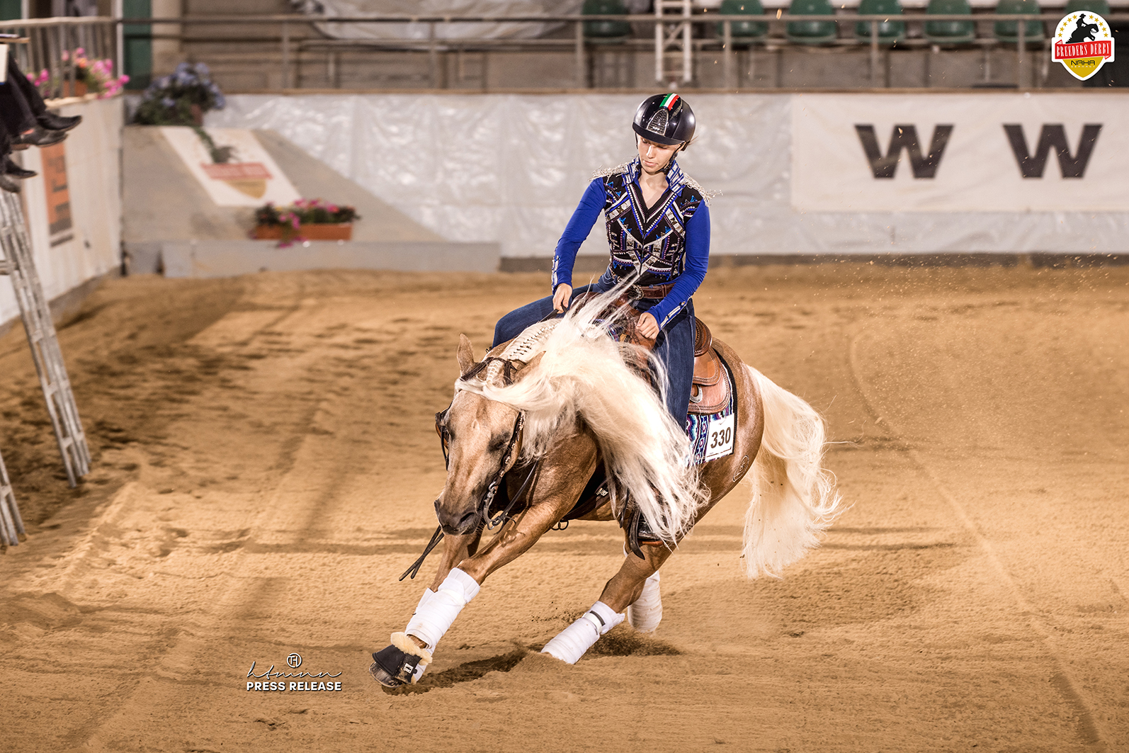 Three riders shared the Reserve Championship in Level 1, all scoring 213 points. Sara Galimberti rode Late Little Whiz (NRHA Three Million Dollar Sire Walla Walla Whiz x Late Little Jaba), Maria Otten was aboard The Spook Coop (Best Spook x Kaliz Golden Happily), and Cornelia Milchram performed with Starlit Spook (NRHA Seven Million Dollar Sire Smart Spook x Gay Light Star).