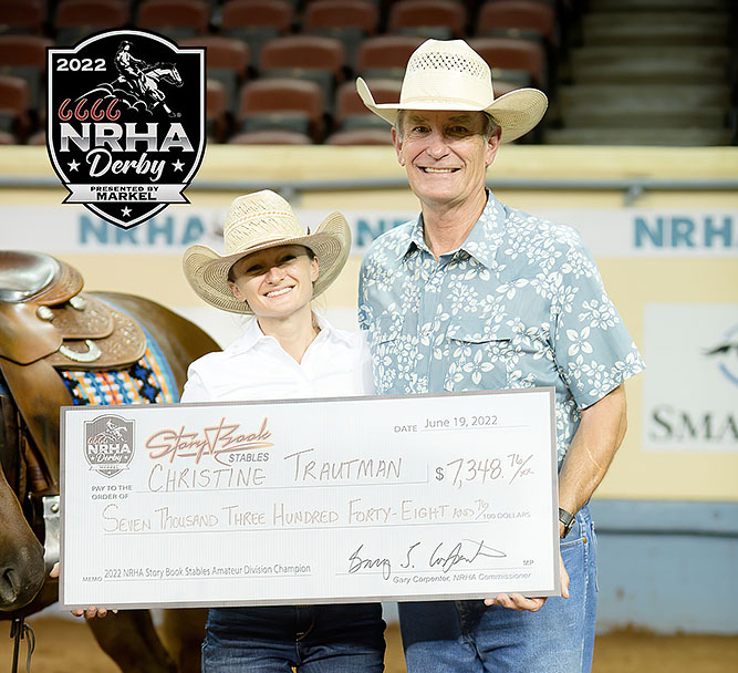 Three championships were decided during the Non Pro preliminaries and awarded immediately after. Christine Trautman and Smart Whizard Spook (Smart Spook x Miss Poco Whizard) won the Story Book Stables Amateur division, while Jack Medows double-dipped, winning the Colston Paving Inc. Non Pro Stakes on Tribbiani (Gunnatrashya x Chicsdreamofdiamonds) and the Clark’s Pump-N-Shop Non Pro Novice Horse Derby on Jewells (Gunner x Surprizentheprincess).