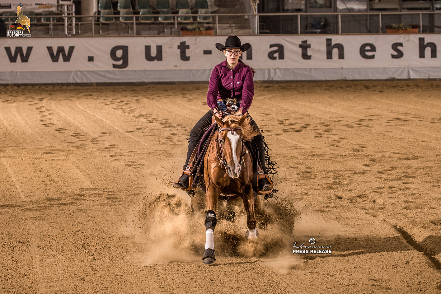 Gaupman was very pleased with her run. “My goal was to have the same score as in the go round and my horse was with me from the beginning, so I was really happy when I heard the score afterwards.” Gaupman originally wasn’t planning to come to Germany, but said she changed her mind after she didn’t have very good run in the ARHA Futurity Finals. “My horse was good, but I had to work on my mindset a lot after Austria, so I am happy that it worked out here. Now we can go to the Italian Futurity like we originally planned.” Highland Gun is a special horse for Gaupmann as she showed his sire at the NRHA Futurity and also his dam at the NRHA European Futurity.