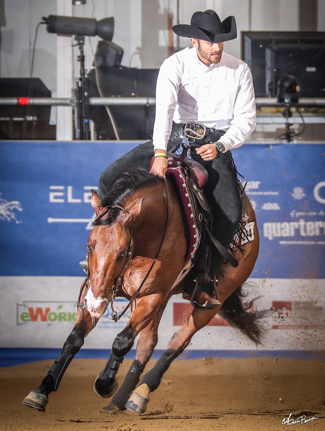 Level of competition ran deep, scores rose, and so did the public’s cheers as some of Europe’s best horses and riders performed in the Veronafiere Arena. Half way through the second section, the loudest cheering was for Poland’s Lukasz Czechowicz and CSG Kenzo (NRHA Million Dollar Sire Colonels Shining Gun x Shiner Brimolena) who thrilled the fans with his powerful yet smooth ride. From the first stop and back, through the fast and precise spins, to the speed transitions and imperceptible lead changes, Czechowicz’s mount stopped deep in the ground raising the dirt which resulted in the highest score of the evening, a 227.5, and the win in both the $ 144.390-Added Level L(4) Championship as well as the $ 38.654-Added L3 title.