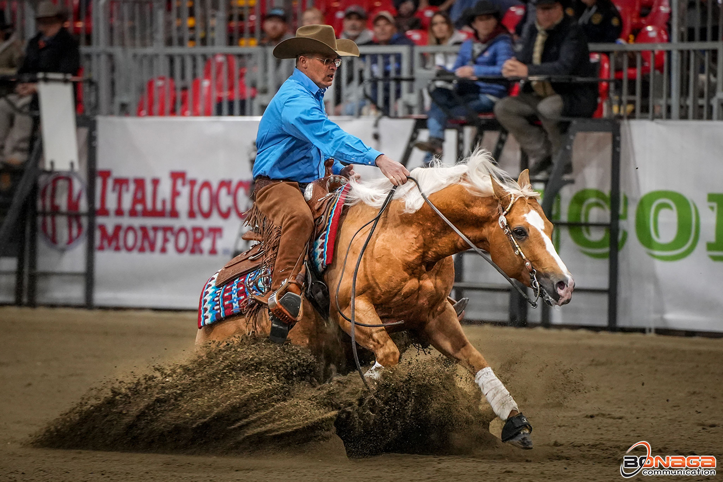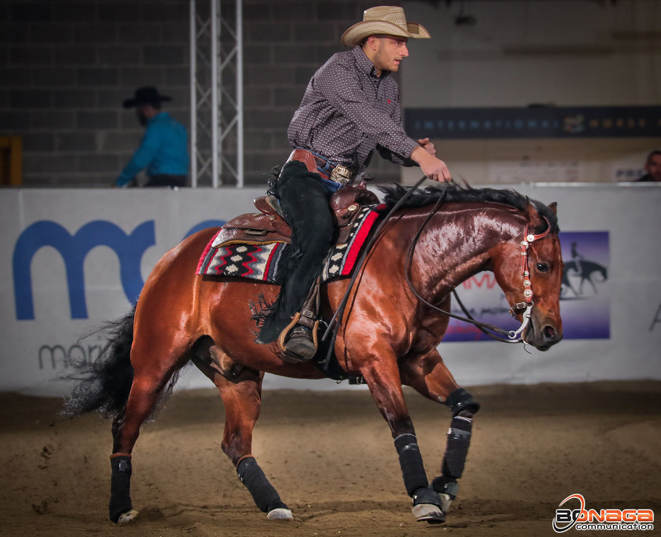 French Professional based in Germany Arnaud Girinon rode Honey First Gunny (NRHA Thirteen Million Dollar Sire Gunner x ARC Honey Chick), owned by Le Fattorie Di Matilde Srl and bred by Vittorio Rabboni to a 223.5 score topping the first section of the Level (L)4 Open Derby Qualifier. In a field of 149 riding for a ticket to the finals, their score held topping the leaderboard. Following his run yesterday, Girinon shared that the flashy 8-year-old stallion’s first 2023 competition was great and was quick to thank the owners and breeder Vittorio Rabboni for trusting him with his horse.