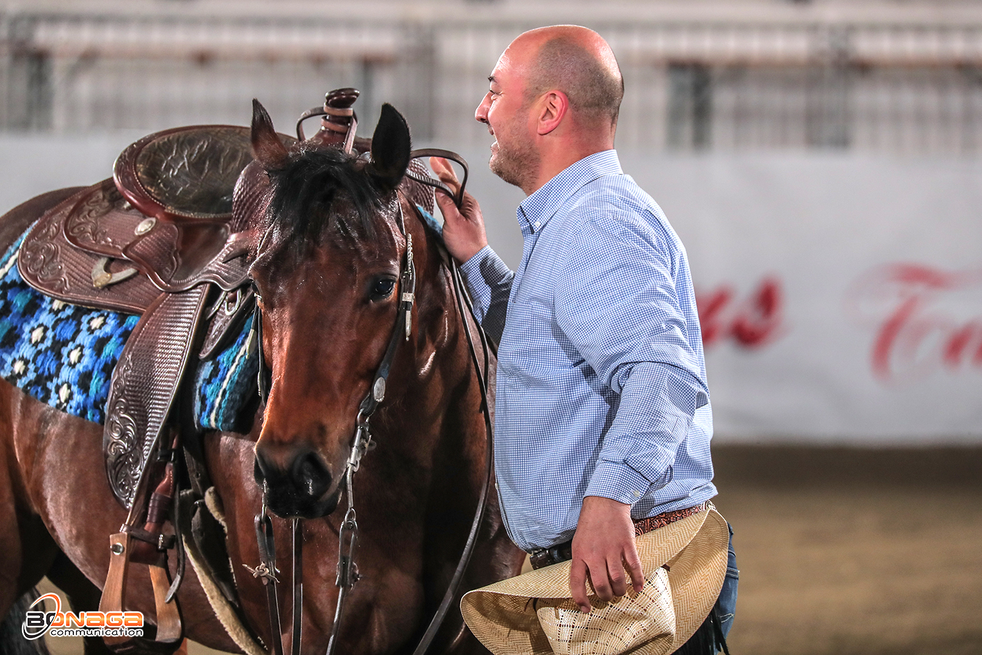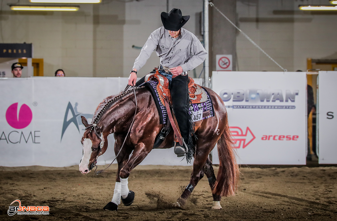 Angelo Benedusi and PL Colonelsmoking CX (NRHA Thirteen Million Dollar Sire Gunner x Nu Dynamite Chex ), an 8-year-old stallion owned by Arianna Aspersi bred by Luigi Parise, scored a 220 for the lead in the IRHA/IRHBA L2 division.