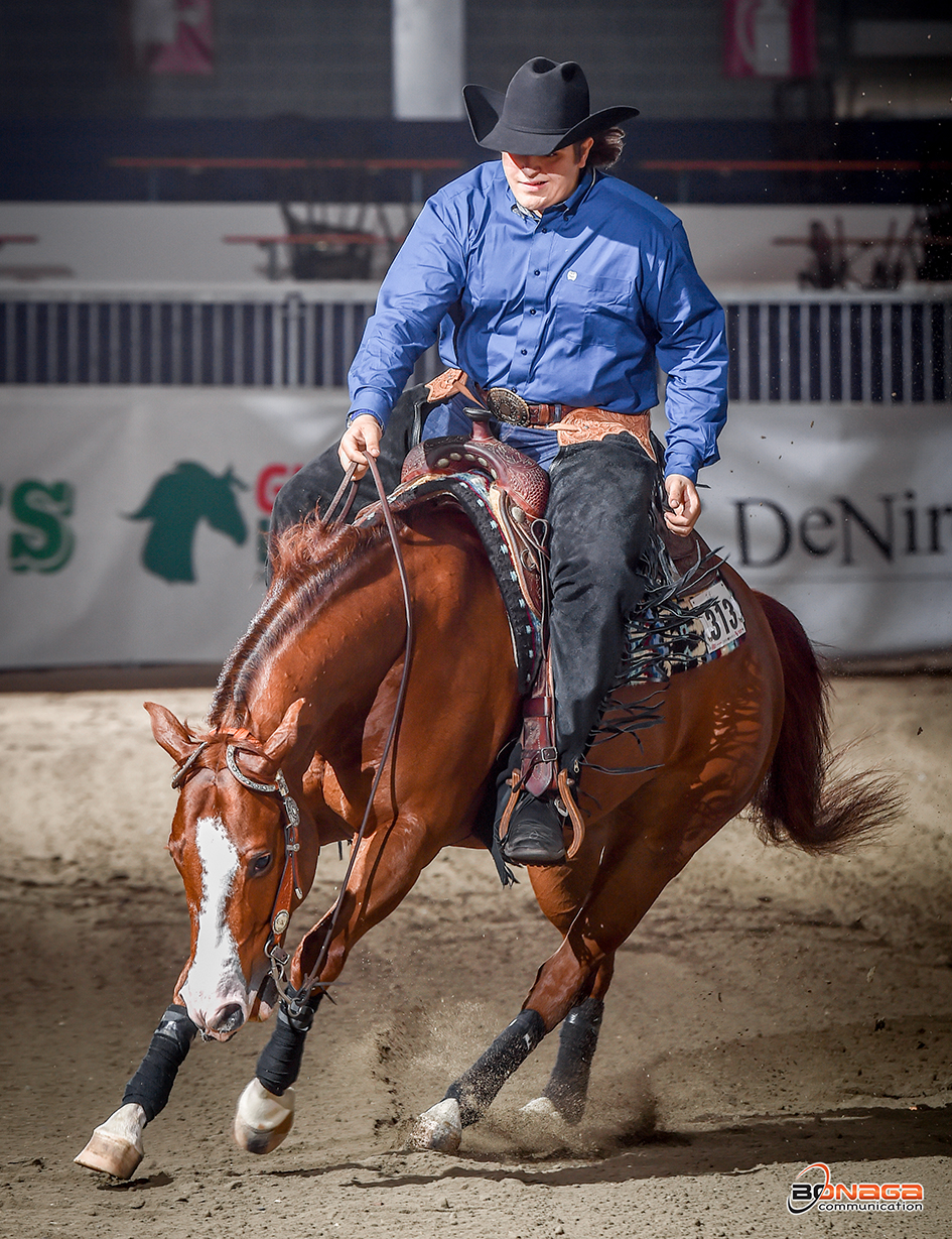 In a field of 22 entries in the NRHA 14-18 Youth class, Lorenzo Ranucci and his 9-year-old gelding Broadlysnapper (Master Snapper x Broadmoor Cassie) came out as winners. Last in the draw, Ranucci stayed calm and steady in his run which earned him a score of 215 and the gold in the class. The young rider was truly excited about his run. “I’m so happy because I have only been riding ‘Snapper’ for about two months, so this is a great accomplishment. He stopped huge today for me and I really enjoyed the run. Next, we plan to go to Switzerland [for the World Reining Championship], so I hope to have a good run there as well,” said the young competitor, who rides with NRHA Professionals Giovanni Masi and Guglielmo Fontana.