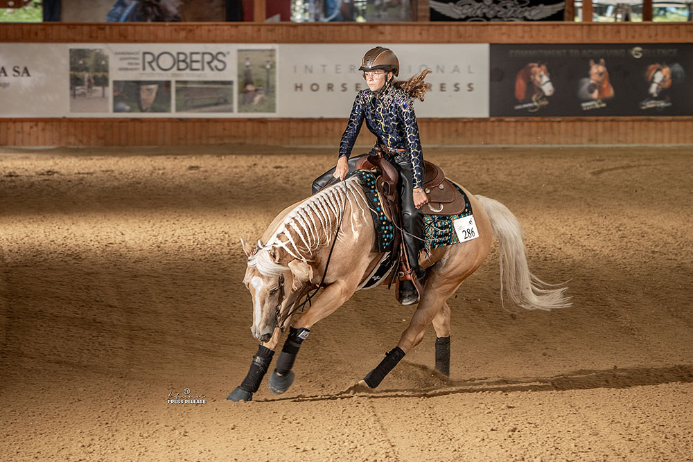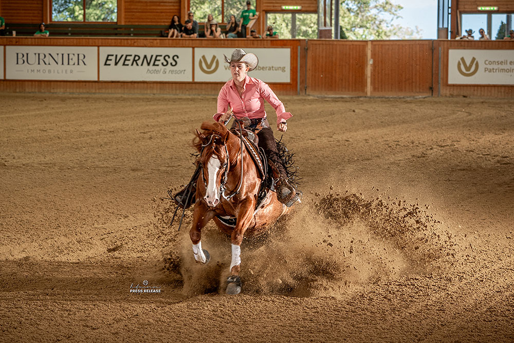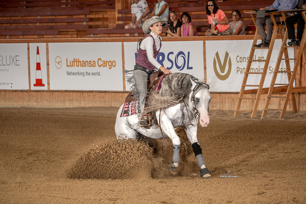 Swiss Adrienne Speidel rode her two horses Wimpysshortstride BB (NRHA Twelve Million Dollar Sire Wimpys Little Step x Short Rooster) and CDC Cromed Resolve (Custom Del Cielo x Kaysolve) to a score of 217.5 to share the Reserve Championship on her two mounts together with Francesca Sternberg of United Kingdom and Red Dirt Paleface (NRHA Three Million Dollar Sire Pale Face Dunnit x Lost In Tinseltown).