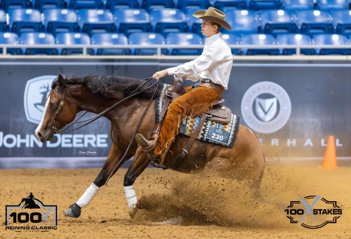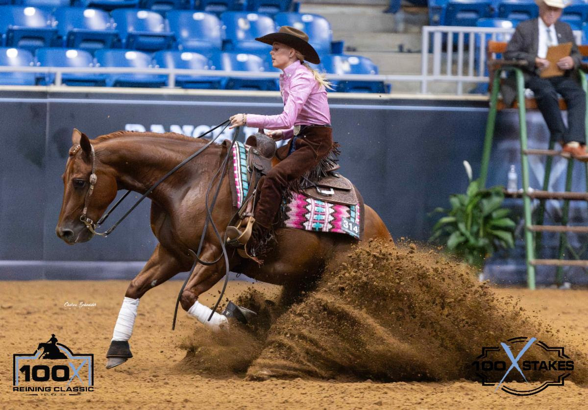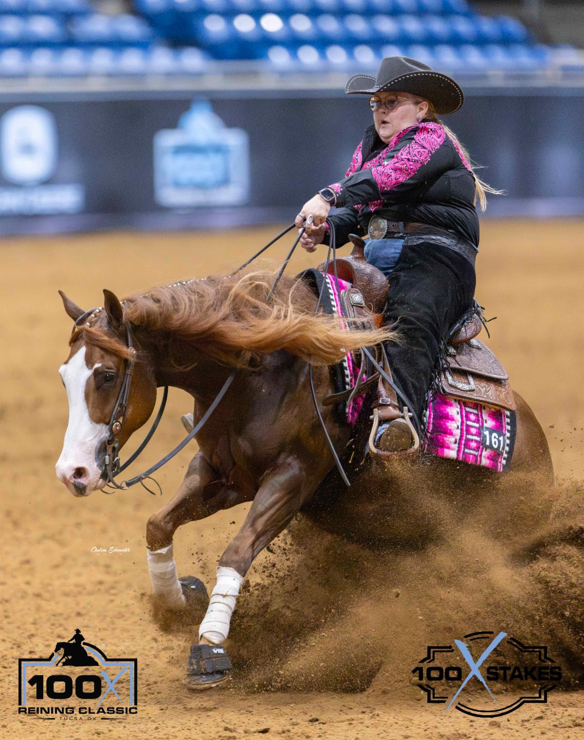 On a special homegrown horse, Gina Schumacher became the 100X Non Pro Stakes Level 4 Champion at the 100X Reining Classic in Tulsa, Oklahoma. Riding CS Nifty Sailor, Schumacher scored an impressive 222.5 to win the Level 4 title as well as the Novice Horse title, adding an additional $105,557 to her lifetime earnings as well as the custom-made MS Diamonds TX Championship ring!