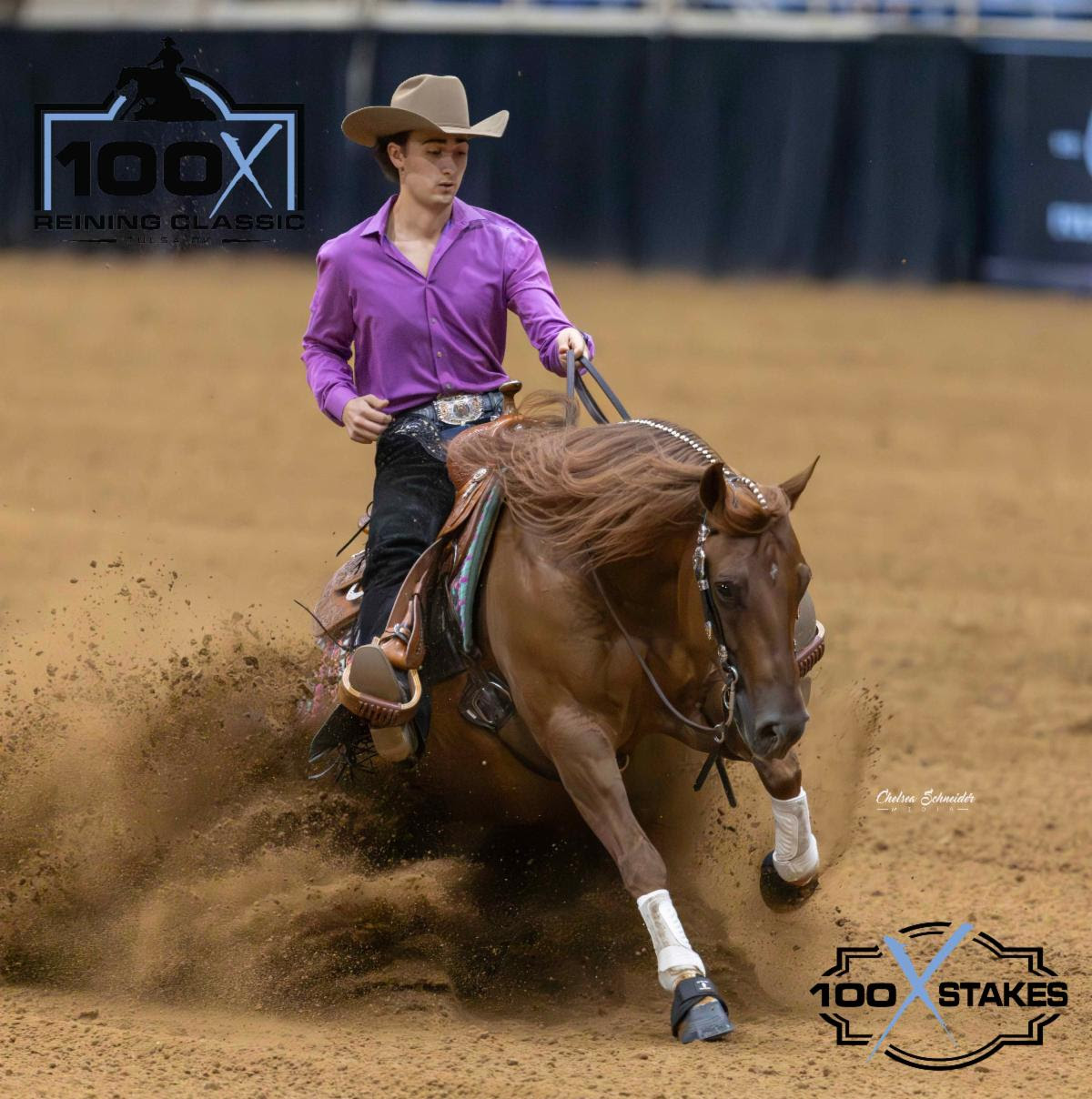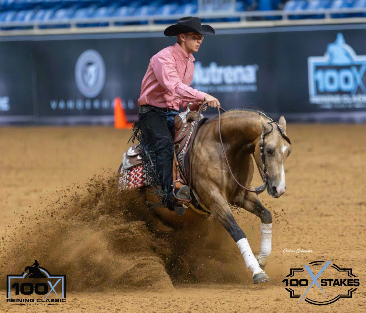 Prior to the 100X Reining Classic, Edouard Winne had never won a buckle. That changed in the 100X Open Stakes Finals when he finally crossed that goal off his ‘buckle list’ with a 219.5 to take the Level 1 Championship. In addition to the Level 1 title, Winne also tied for fourth in the Level 4, and topped the Lawrence Ranch Level 1 and Level 2 Open Mare Bonus for total earnings of $32,750.