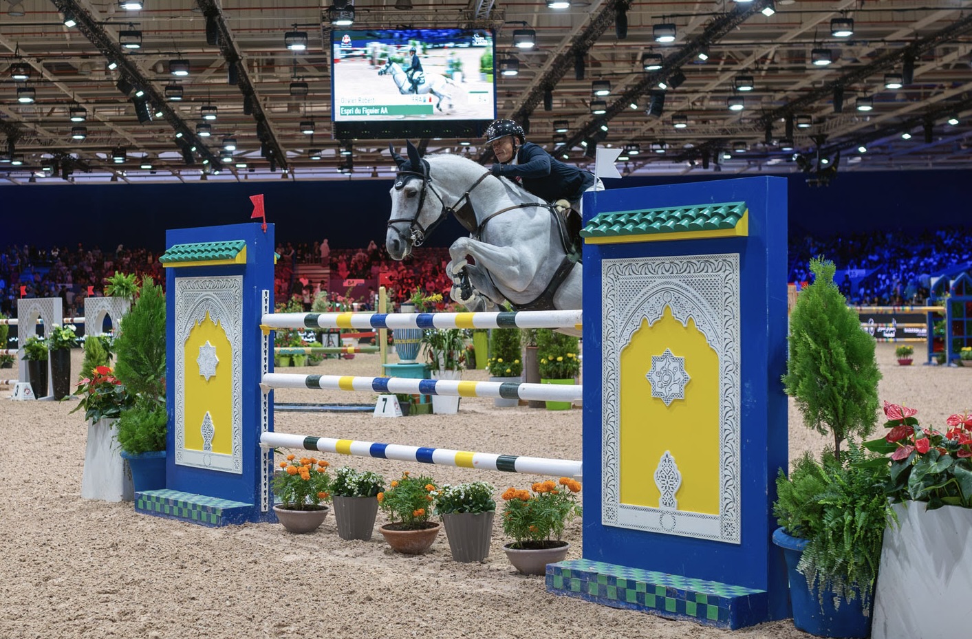 The CSI4* day began with a French victory in the Grand Prix FBP, a Faults and Time class with Olivier Robert and his 9-year-old grey Anglo-Arab stallion Espri du Figuier, shown in his first indoor show. The prize-giving ceremony was attended by four greys out of the five horses invited to the honours. The only non-grey in the top 5 was Liechtenstein’s Jennifer Hochstadter’s bay, Tinka’s Hero, who held the lead in  the class for a long time. Her mount is one of Simon Delestre’s former horses with whom the Lorrain native won last year’s Winning Round in Tetouan.
