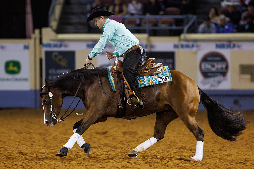 Gabriel Diano rode Alpha Quarter Horses’ SS Whatcha Gun Doo to a 221 to tie for the NRHA Futurity Open Level 2 Championship.