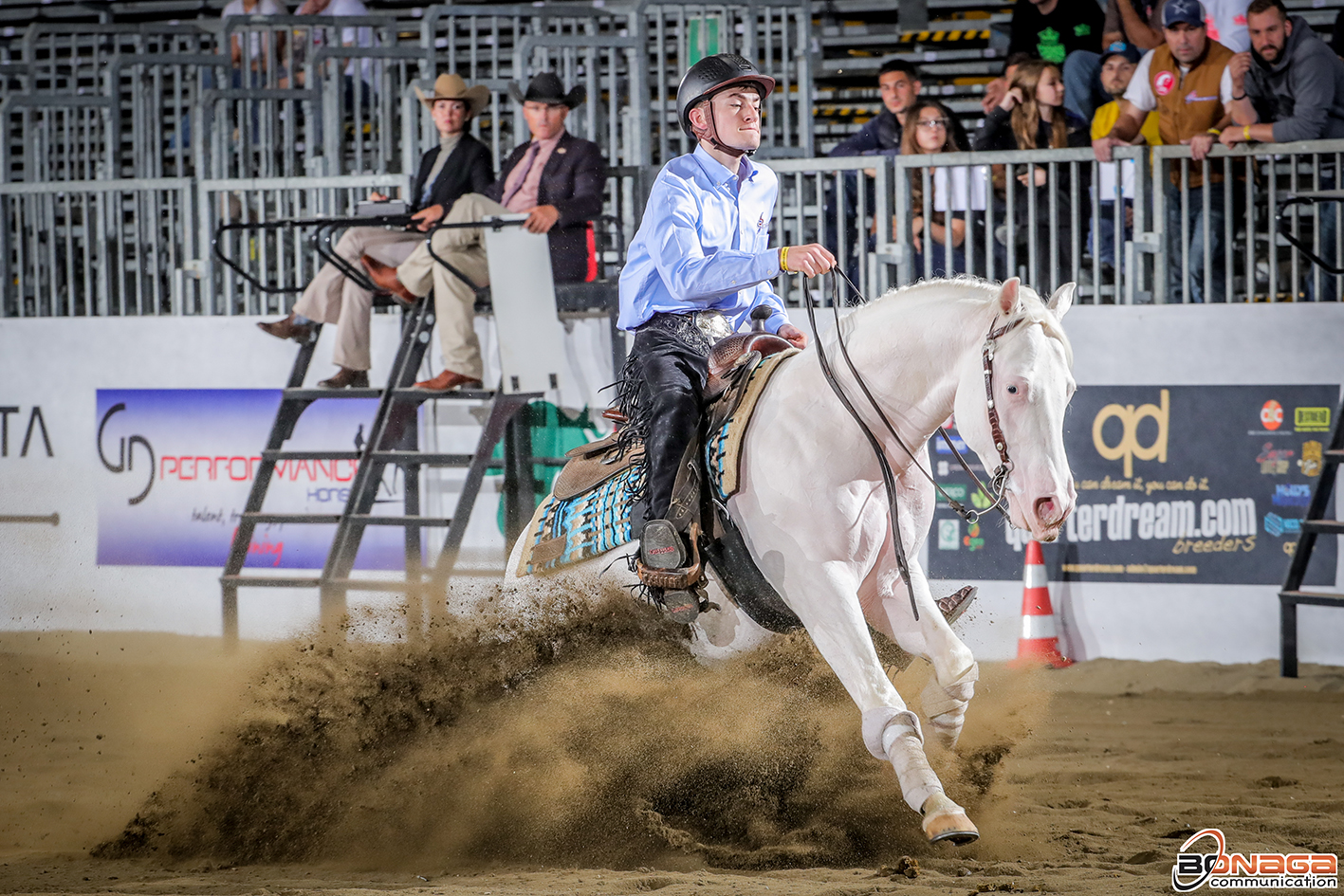 Two riders walked out of the pen with a score of 213.5 to top the L2 Non Pro division counting 32 entries: Matt Legrand, a French youth rider aboard GB Malibu Gunrise (NRHA Million Dollar Sire Colonels Shining Gun x LC Electric Lady), a stallion owned and nominated by Gregory Legrand, and Italy’s Cecilia Frediani and her Shes A Spark (Spark N Whiz x Shes A Lil Showgirl), a mare nominated by Edoardo Bernardelli.