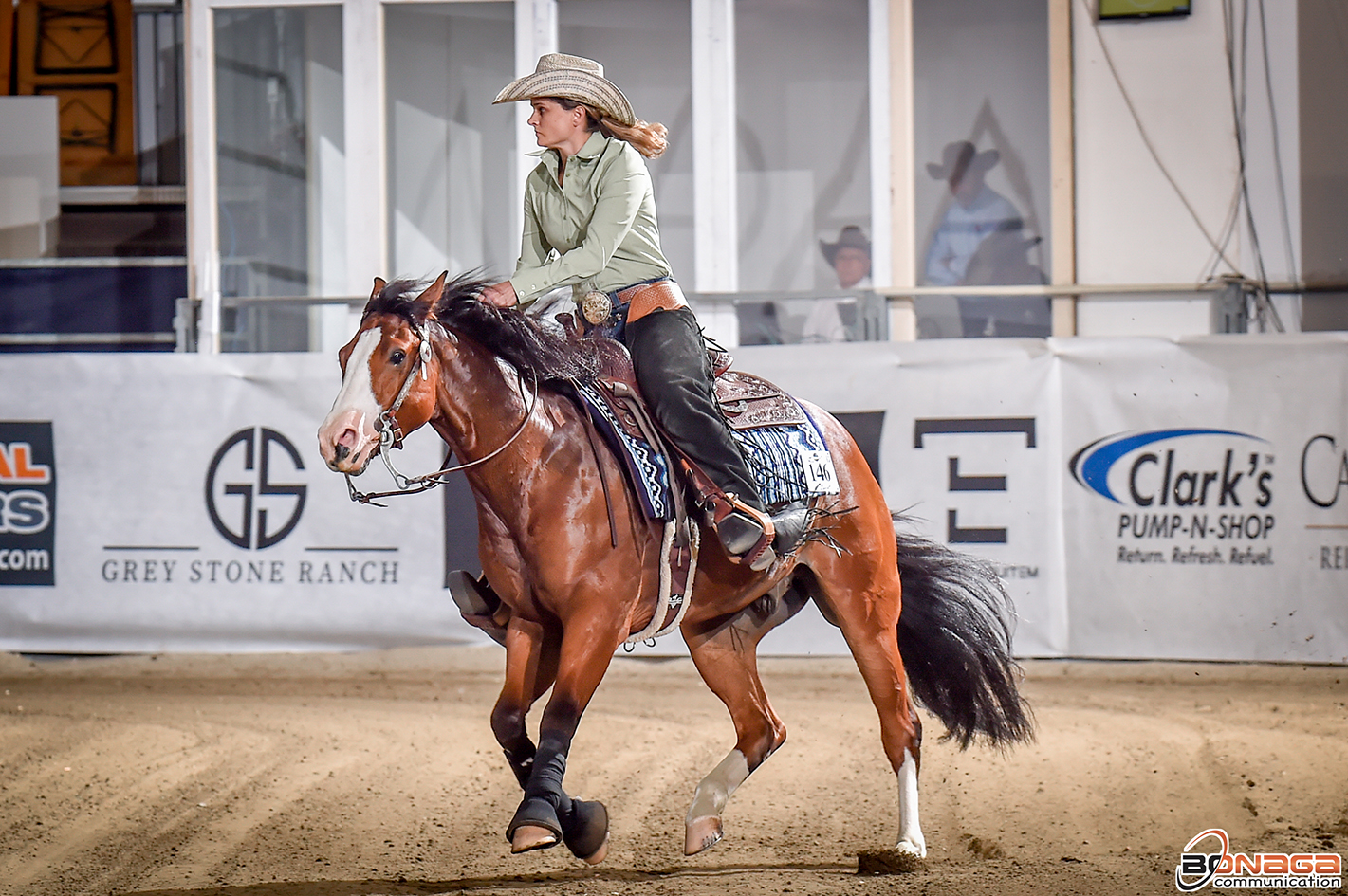 51 horse-rider combinations competed in the De Niro Boot Co Non Pro qualifier to earn a spot in the De Niro Boot Co Non Pro finals that will take place on Friday. It was the young talented rider of Austria, Anna-Maria Zehetbauer, who rose to the top of the leader board in the Level (L)4 division with Zeidelhof Reining Horses’ mare SS Pretty Nifty (NRHA Three Million Dollar Sire A Sparkling Vintage x Custom Nifty Nic). The duo scored 219 to lead the field of 31 entries. SS Pretty Nifty is a NRHA Markel Futurity Sale graduate and was nominated by Richard Zeidelhof.