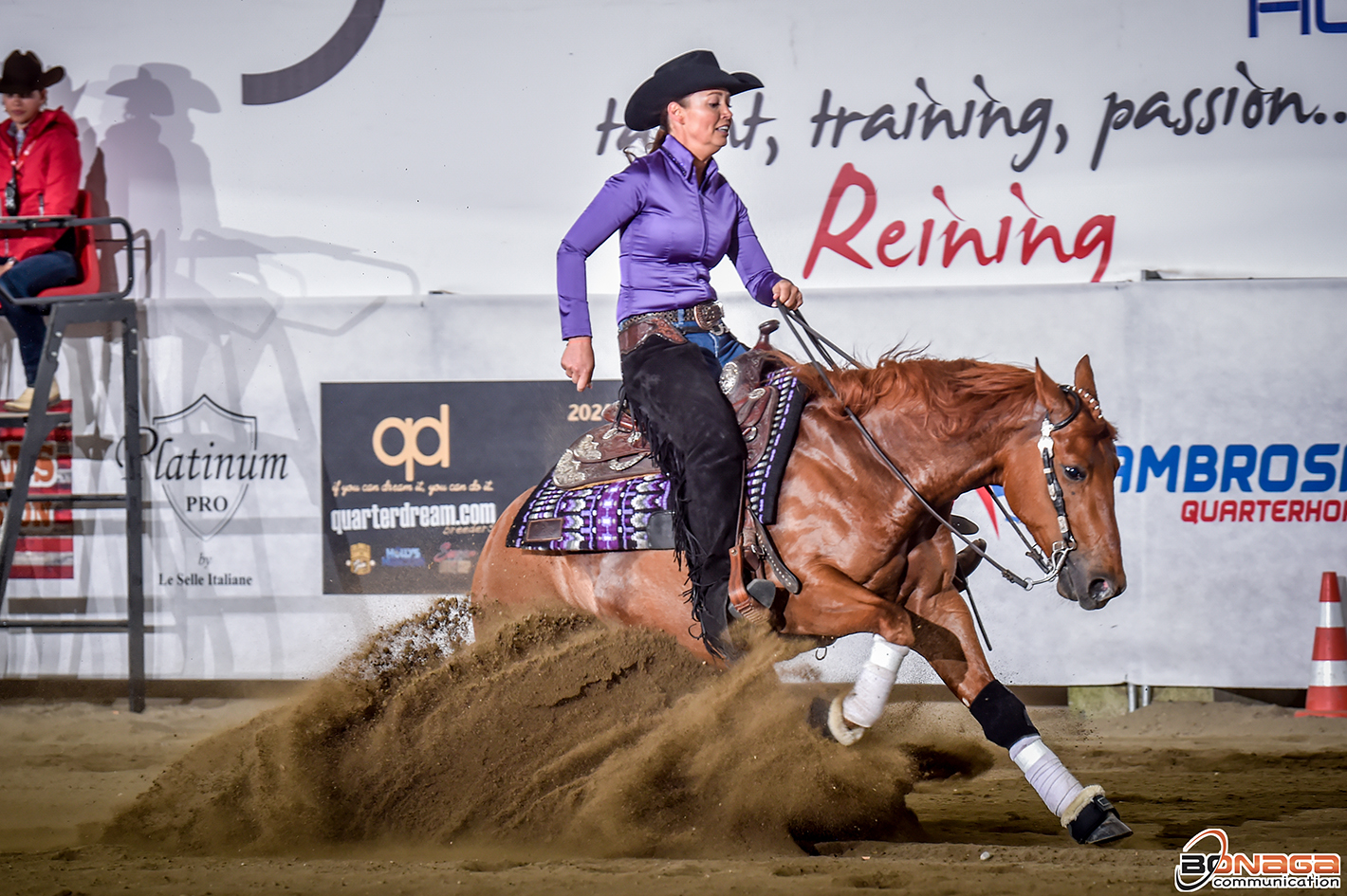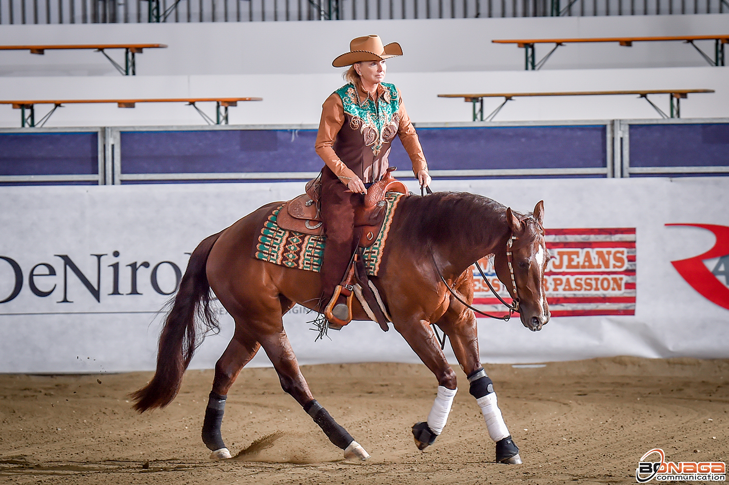 Currently leading in the first section of the MS Diamonds TX L4 European Futurity Open qualifier is the NRHA Million Dollar Rider Ann Fonck of Belgium with Katharina Mayer’s Single Malt Xo (NRHA Million Dollar Sire In Like Flinn x Gunners Doll), a gelding nominated by Fabien Boiron. The duo scored 220.5 to top the leaderboard.