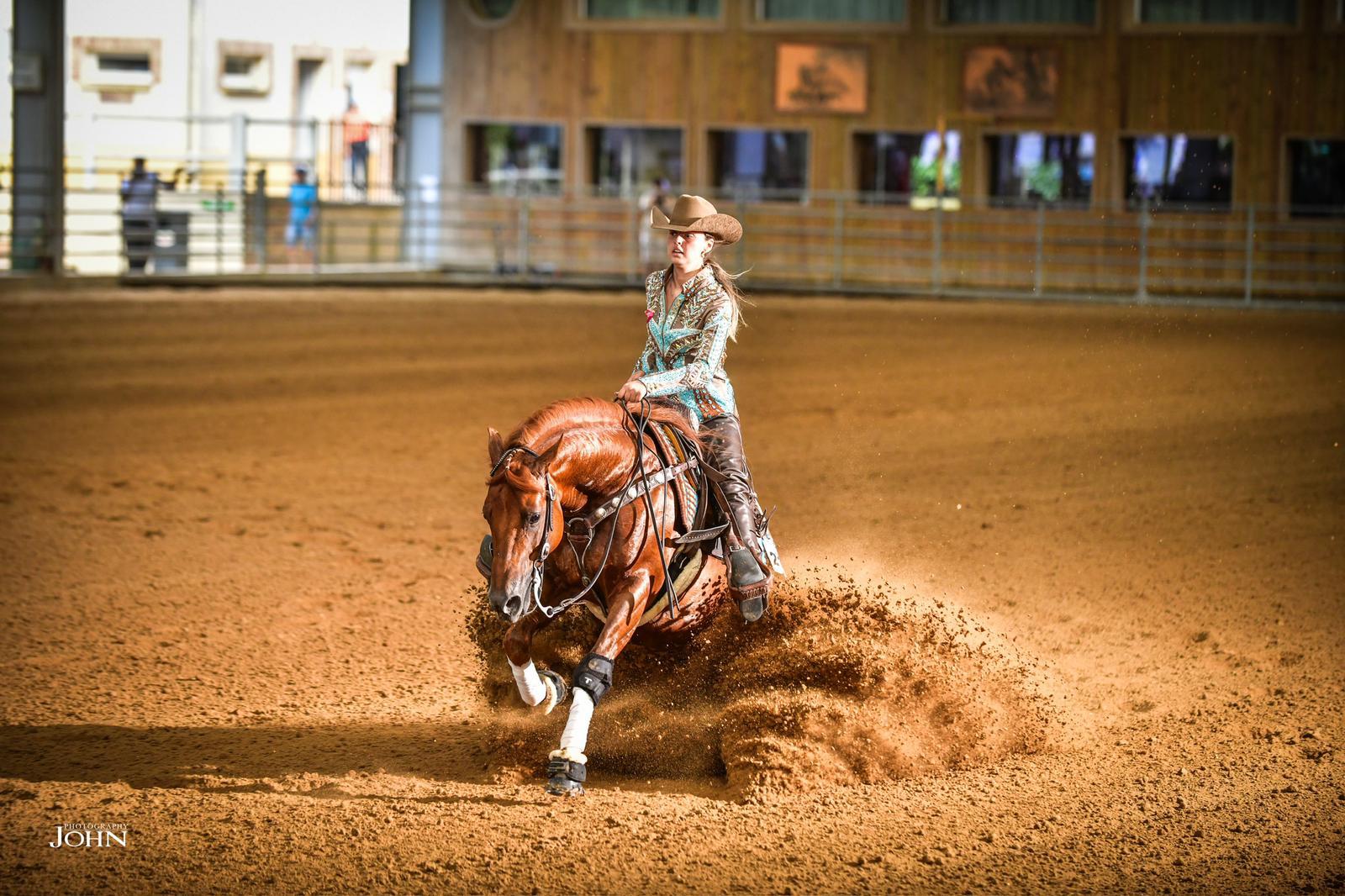 Jody Fonck of Belgium rode Sabrina Adams’ Arnels Spat Olena (NRHA Million Dollar Sire Spat Olena x RS Arnels Feo Jac) in the first section of the EAC Open classes. The young rider did not hold back and guided the 7-year-old stallion to an impressive score of 220.5. As the second section concluded in the evening, Fonck’s score still held and the duo clinched the $500-Added NRHA EAC Donut Limited Open Championship. “I feel amazing today; I have a super sweet horse and a great supportive owner, so this was great,” she said. “I think the key is to give our horses confidence and love and ride them well. When we go in, they just do it for us. He also gives me enough confidence. I know when I show and I need him, he is always there for me and has my back.”