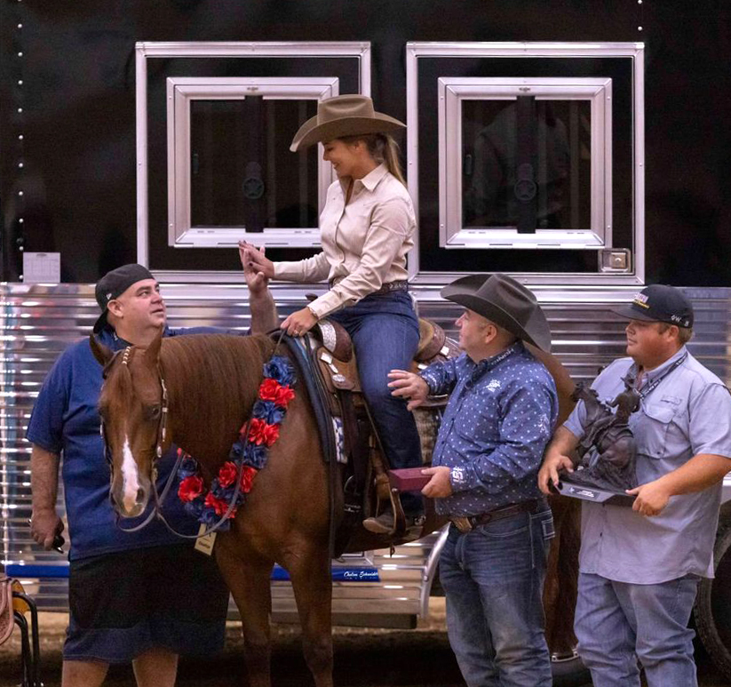 Opening the games yesterday was the Bloomer Trailers Rookie Invitational. Taking the win with a 217.5 score was Kelsey Flessner riding her own Chics Guna Dream (Magnum Chic Dream x Gun Whiz It). The young competitor, who rides under the guidance of NRHA Professional Dany Tremblay, took home a paycheck worth $1092.50, a Bloomer Trailer, a saddle, a buckle, and more! Today it’s time for the $50,000-Added Non Pro Championships.