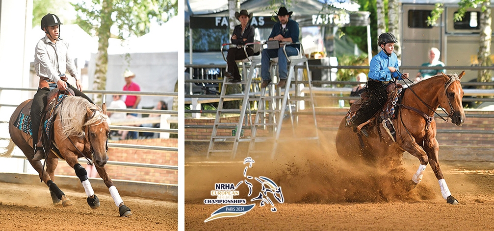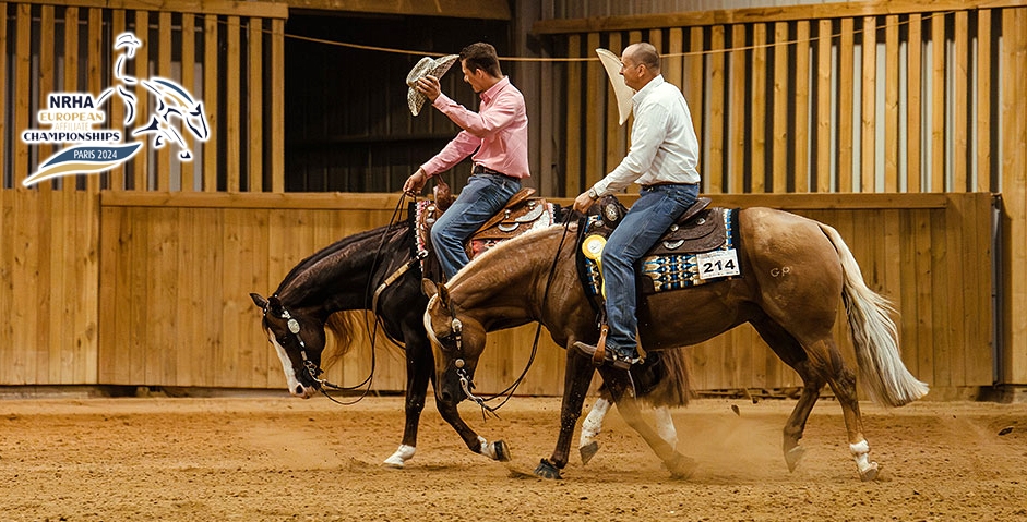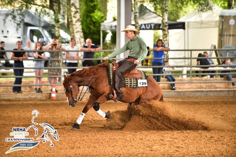 Le Pin, July 20 — The 2024 edition of the NRHA European Affiliate Championships counting 292 entries closed with the exciting $10,000-Added NRHA EA Open Championship run class in class with the $500-Added Donut NRHA EA Limited Open Championship. NRHA Two Million Dollar Rider Bernard Fonck and Arnaud Girinon both performed to a 225 score and opted to share the Championship. The EA Limited Open Championship remained in the Fonck family as 18-year-old Jody rode to a 220.5 and the top step of the podium.